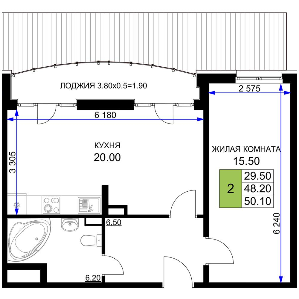 - Жилая площадь 29.5 м²