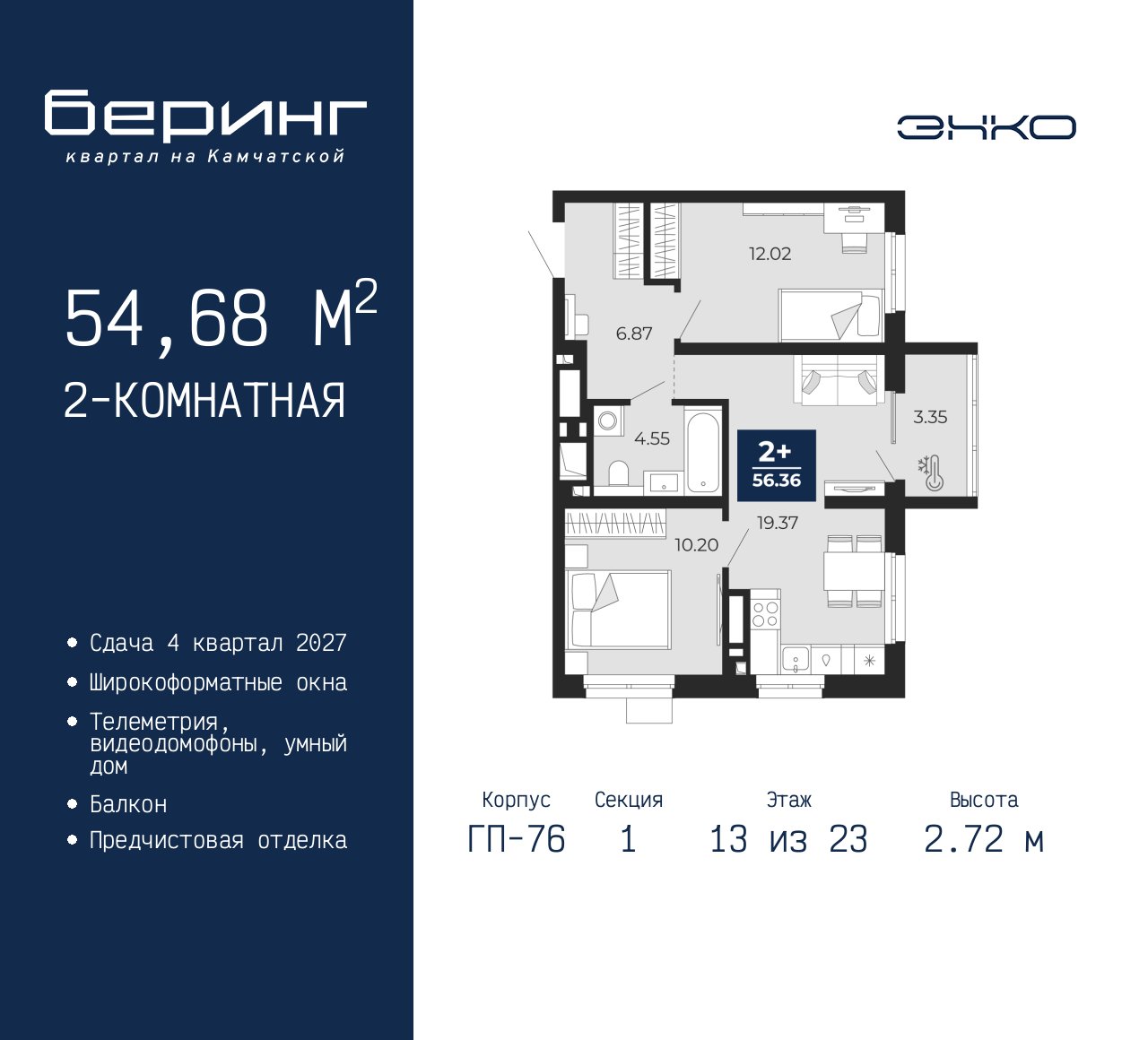 Продается 2-комн. квартира с предчистовой отделкой в ЖК "Беринг" на 13 этаже. Общая площадь: 54.68 кв.м., жилая: 22.22 кв.м., площадь просторной кухни-столовой: 19.37 кв.м. Угловая квартира, идеально подойдет любителям тишины и панорамных видов. В квартире один балкон, один совмещенный санузел. Высота потолков 2.72 м. Дом монолитный, черырехподъездный, переменной этажности, от 19 до 24 этажей. Квартира находится в 1-й секции высотой 23 этажа в корпусе ГП-76. На этаже 7 квартир. В подъезде 2 пассажирских и 1 грузовой лифт. Окончание строительства - 4 квартал 2027 года. Оформление сделки по договору долевого участия. Подобно знаменитому исследователю, мы чувствуем себя первооткрывателями этой локации. Хотим показать новую суть места, сформировать для вас жизненный опыт, которого ещё не было. Беринг — район зелёного цвета. Беринг — район, который откроется вам с другой стороны. Впечатлит новым уровнем комфорта и качеством жизни. Беринг — открытие на карте города. Первый квартал расположен в районе Тура, в границах улиц: Камчатская – Западносибирская – Энтузиастов. Вокруг уже есть всё для того, чтобы ежедневная рутина была лишь частью жизни и не доставляла дискомфорта. Школы и детские сады, магазины и аптеки, поликлиника, места для семейного отдыха, пеших и велопрогулок, и даже рыбалки. Масштабное озеленение дворов — визитная карточка ЭНКО и ваш оазис спокойствия, чтобы отвлечься от повседневности. Раскидистые деревья, кустарники, травы и цветы — осталось остановиться, вдохнуть и расслабиться, глядя на эту природную красоту. Стилистика подъездов продолжает концепцию Беринга, вдохновлённого Камчаткой: сдержанный, но при этом впечатляющий дизайн соседствует с удобством и функциональностью. (AQID02518024)