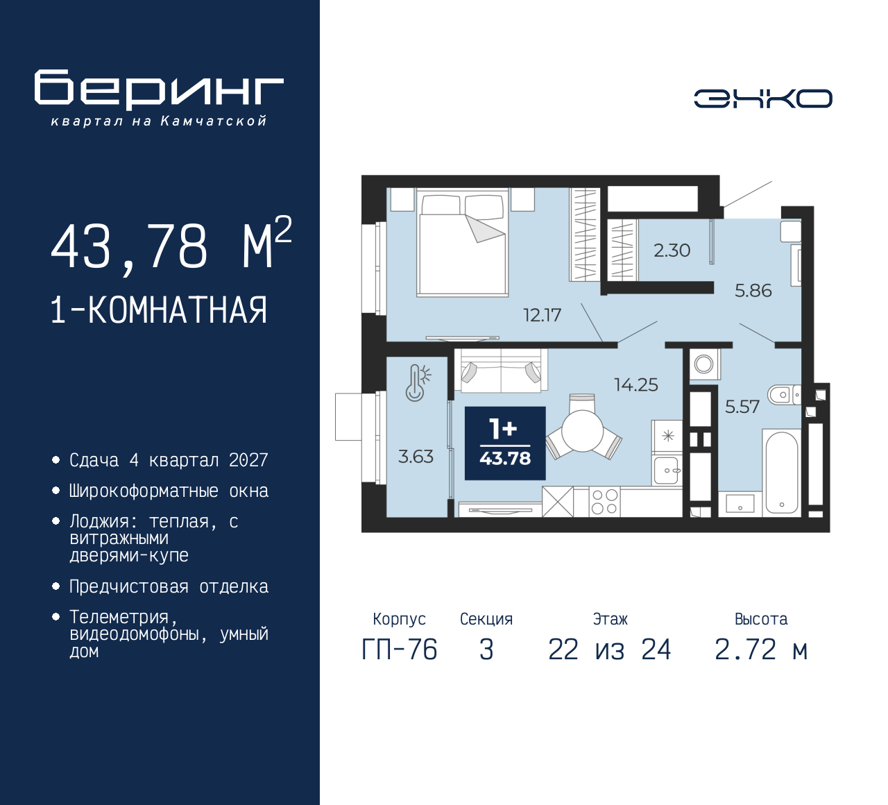 Однокомнатная квартира с предчистовой отделкой в ЖК "Беринг" на 22 этаже. Общая площадь: 43.78 кв.м., жилая: 12.17 кв.м., площадь просторной кухни-столовой: 14.25 кв.м. Все окна выходят на одну сторону. В квартире одна лоджия, один совмещенный санузел. Высота потолков 2.72 м. Дом монолитный, черырехподъездный, переменной этажности, от 19 до 24 этажей. Квартира находится в 3-й секции высотой 24 этажа в корпусе ГП-76. На этаже 6 квартир. В подъезде 1 пассажирский и 1 грузовой лифт. Окончание строительства - 4 квартал 2027 года. Оформление сделки по договору долевого участия. Подобно знаменитому исследователю, мы чувствуем себя первооткрывателями этой локации. Хотим показать новую суть места, сформировать для вас жизненный опыт, которого ещё не было. Беринг — район зелёного цвета. Беринг — район, который откроется вам с другой стороны. Впечатлит новым уровнем комфорта и качеством жизни. Беринг — открытие на карте города. Первый квартал расположен в районе Тура, в границах улиц: Камчатская – Западносибирская – Энтузиастов. Вокруг уже есть всё для того, чтобы ежедневная рутина была лишь частью жизни и не доставляла дискомфорта. Школы и детские сады, магазины и аптеки, поликлиника, места для семейного отдыха, пеших и велопрогулок, и даже рыбалки. Масштабное озеленение дворов — визитная карточка ЭНКО и ваш оазис спокойствия, чтобы отвлечься от повседневности. Раскидистые деревья, кустарники, травы и цветы — осталось остановиться, вдохнуть и расслабиться, глядя на эту природную красоту. Стилистика подъездов продолжает концепцию Беринга, вдохновлённого Камчаткой: сдержанный, но при этом впечатляющий дизайн соседствует с удобством и функциональностью. (AQID02529261)