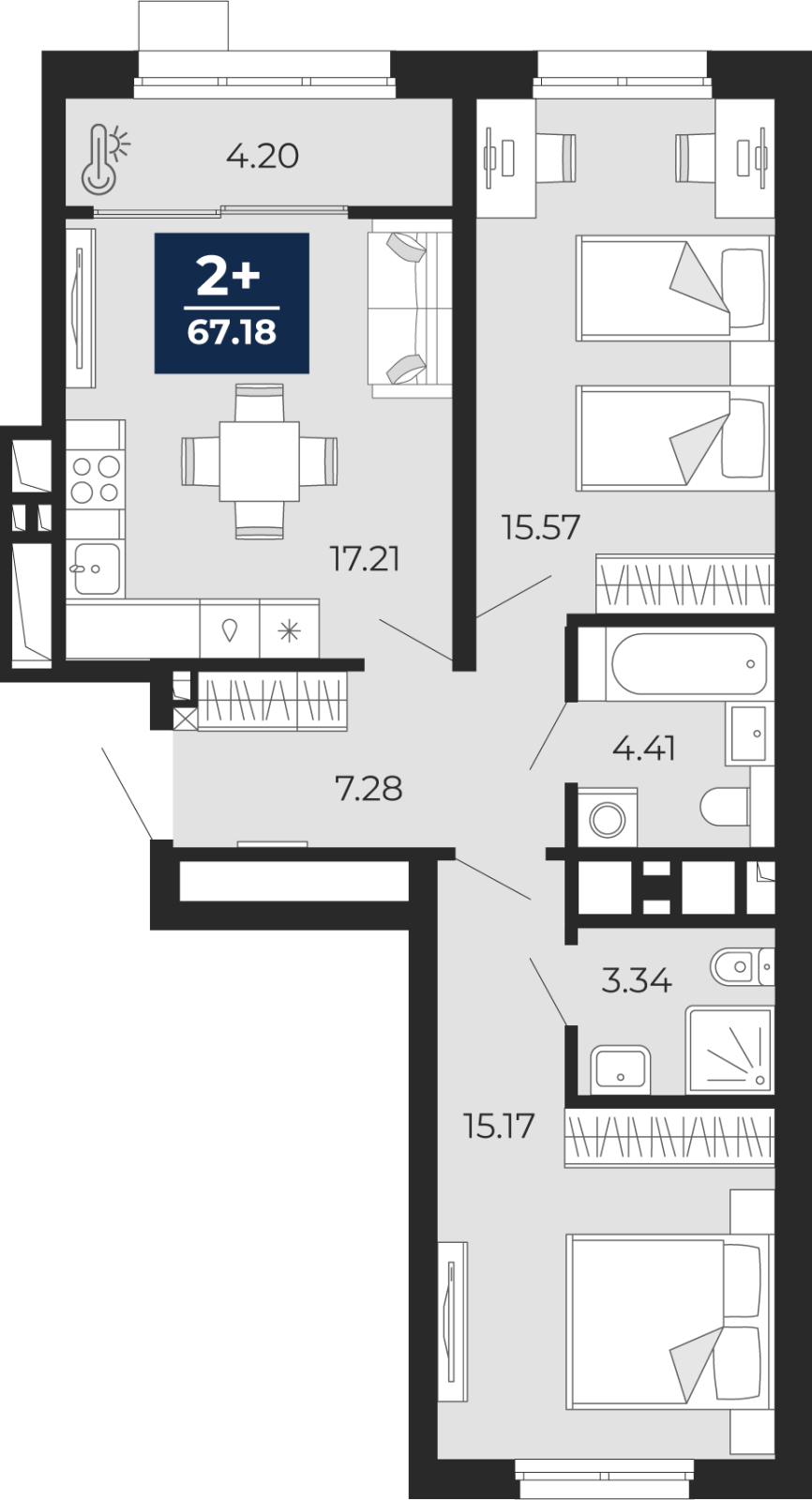 Двухкомнатная квартира с предчистовой отделкой в ЖК "Беринг" на 22 этаже. Общая площадь: 67.18 кв.м., жилая: 30.74 кв.м., площадь просторной кухни-столовой: 17.21 кв.м. Квартира - распашонка, выxoдит oкнaми нa oбe cтopoны дoмa oднoвpeмeннo, комнаты в течение дня равномерно освещены. В квартире одна лоджия, два совмещенных санузла. Высота потолков 2.72 м. Дом монолитный, черырехподъездный, переменной этажности, от 19 до 24 этажей. Квартира находится в 3-й секции высотой 24 этажа в корпусе ГП-76. На этаже 6 квартир. В подъезде 1 пассажирский и 1 грузовой лифт. Окончание строительства - 4 квартал 2027 года. Оформление сделки по договору долевого участия. Подобно знаменитому исследователю, мы чувствуем себя первооткрывателями этой локации. Хотим показать новую суть места, сформировать для вас жизненный опыт, которого ещё не было. Беринг — район зелёного цвета. Беринг — район, который откроется вам с другой стороны. Впечатлит новым уровнем комфорта и качеством жизни. Беринг — открытие на карте города. Первый квартал расположен в районе Тура, в границах улиц: Камчатская – Западносибирская – Энтузиастов. Вокруг уже есть всё для того, чтобы ежедневная рутина была лишь частью жизни и не доставляла дискомфорта. Школы и детские сады, магазины и аптеки, поликлиника, места для семейного отдыха, пеших и велопрогулок, и даже рыбалки. Масштабное озеленение дворов — визитная карточка ЭНКО и ваш оазис спокойствия, чтобы отвлечься от повседневности. Раскидистые деревья, кустарники, травы и цветы — осталось остановиться, вдохнуть и расслабиться, глядя на эту природную красоту. Стилистика подъездов продолжает концепцию Беринга, вдохновлённого Камчаткой: сдержанный, но при этом впечатляющий дизайн соседствует с удобством и функциональностью. (AQID02529330)