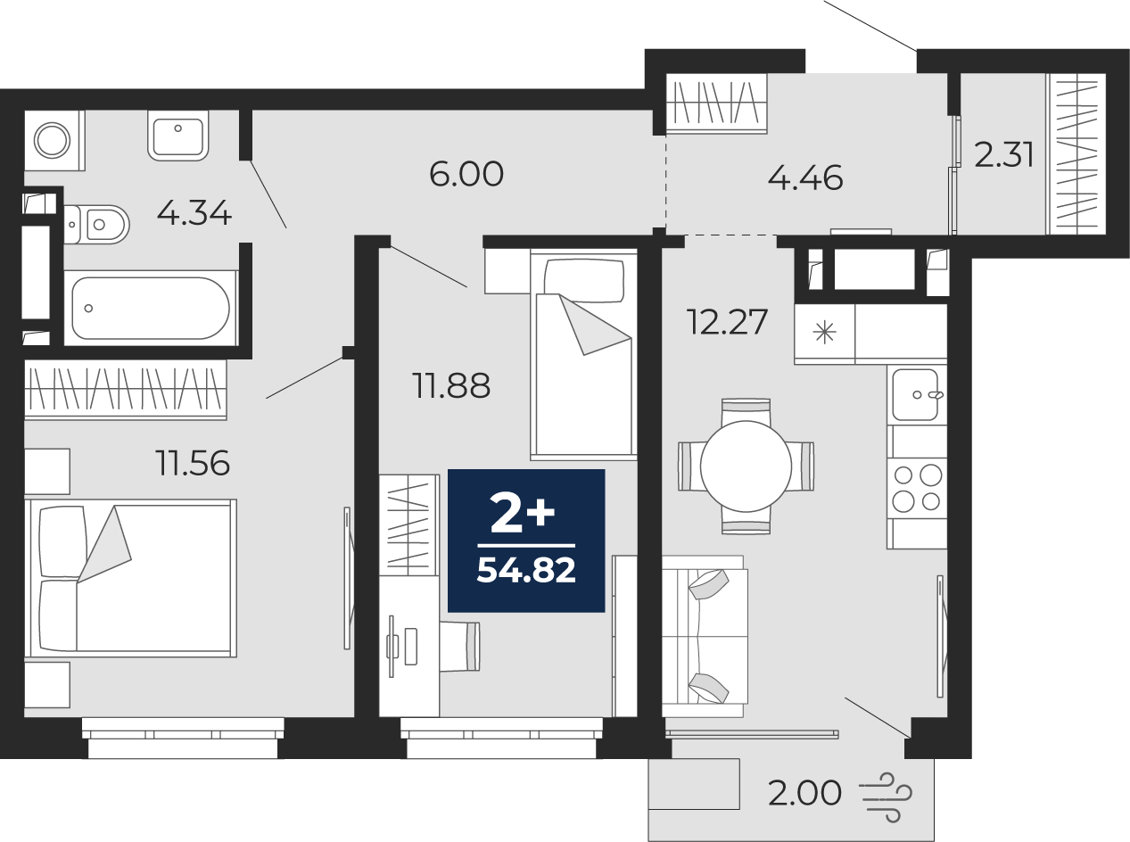 - Площадь кухни 12.27 м²