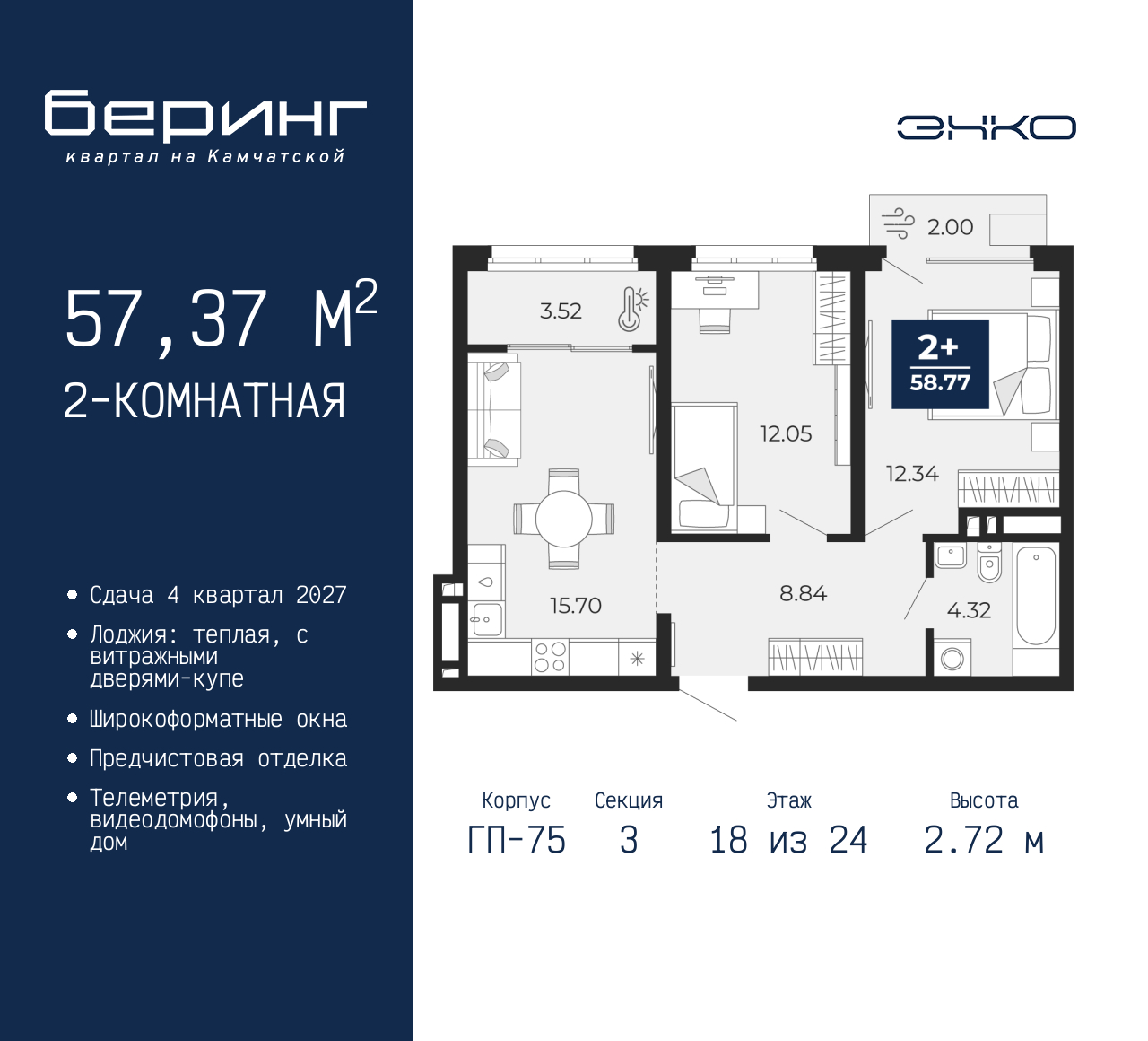 Продается 2-комн. квартира от застройщика с предчистовой отделкой в ЖК "Беринг" на 18 этаже. Общая площадь: 57.37 кв.м., жилая: 24.39 кв.м., площадь просторной кухни-столовой: 15.7 кв.м. Комнаты изолированные, все окна выходят на одну сторону. В квартире один балкон и одна лоджия, один совмещенный санузел. Высота потолков 2.72 м. Дом монолитный, многоподъездный, переменной этажности, от 17 до 24 этажей. Квартира находится в 3-й секции высотой 24 этажа в корпусе ГП-75. На этаже 6 квартир. В подъезде 2 пассажирских и 1 грузовой лифт. Окончание строительства - 4 квартал 2027 года. Оформление сделки по договору долевого участия. Подобно знаменитому исследователю, мы чувствуем себя первооткрывателями этой локации. Хотим показать новую суть места, сформировать для вас жизненный опыт, которого ещё не было. Беринг — район зелёного цвета. Беринг — район, который откроется вам с другой стороны. Впечатлит новым уровнем комфорта и качеством жизни. Беринг — открытие на карте города. Первый квартал расположен в районе Тура, в границах улиц: Камчатская – Западносибирская – Энтузиастов. Вокруг уже есть всё для того, чтобы ежедневная рутина была лишь частью жизни и не доставляла дискомфорта. Школы и детские сады, магазины и аптеки, поликлиника, места для семейного отдыха, пеших и велопрогулок, и даже рыбалки. Масштабное озеленение дворов — визитная карточка ЭНКО и ваш оазис спокойствия, чтобы отвлечься от повседневности. Раскидистые деревья, кустарники, травы и цветы — осталось остановиться, вдохнуть и расслабиться, глядя на эту природную красоту. Стилистика подъездов продолжает концепцию Беринга, вдохновлённого Камчаткой: сдержанный, но при этом впечатляющий дизайн соседствует с удобством и функциональностью. (AQID02529711)
