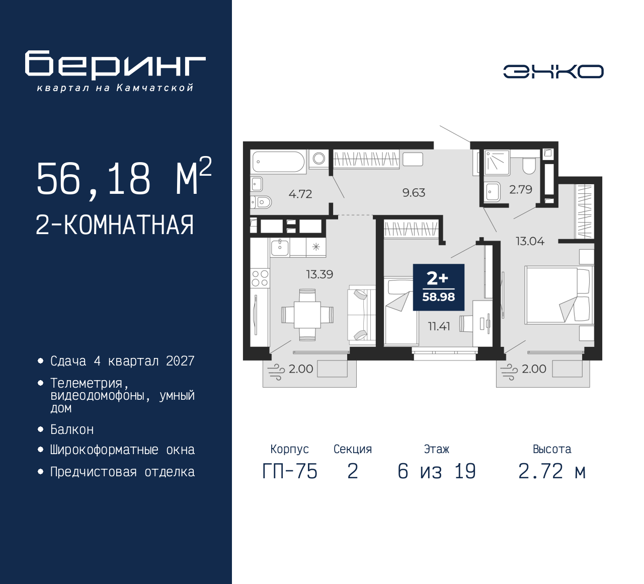 Просторная 2-комн. квартира с предчистовой отделкой в ЖК "Беринг" на 6 этаже. Общая площадь: 56.18 кв.м., жилая: 24.45 кв.м., площадь просторной кухни-столовой: 13.39 кв.м. Комнаты изолированные, все окна выходят на одну сторону. В квартире два балкона, два совмещенных санузла. Высота потолков 2.72 м. Дом монолитный, многоподъездный, переменной этажности, от 17 до 24 этажей. Квартира находится во 2-й секции высотой 19 этажей в корпусе ГП-75. На этаже 7 квартир. В подъезде 2 пассажирских и 1 грузовой лифт. Окончание строительства - 4 квартал 2027 года. Оформление сделки по договору долевого участия. Подобно знаменитому исследователю, мы чувствуем себя первооткрывателями этой локации. Хотим показать новую суть места, сформировать для вас жизненный опыт, которого ещё не было. Беринг — район зелёного цвета. Беринг — район, который откроется вам с другой стороны. Впечатлит новым уровнем комфорта и качеством жизни. Беринг — открытие на карте города. Первый квартал расположен в районе Тура, в границах улиц: Камчатская – Западносибирская – Энтузиастов. Вокруг уже есть всё для того, чтобы ежедневная рутина была лишь частью жизни и не доставляла дискомфорта. Школы и детские сады, магазины и аптеки, поликлиника, места для семейного отдыха, пеших и велопрогулок, и даже рыбалки. Масштабное озеленение дворов — визитная карточка ЭНКО и ваш оазис спокойствия, чтобы отвлечься от повседневности. Раскидистые деревья, кустарники, травы и цветы — осталось остановиться, вдохнуть и расслабиться, глядя на эту природную красоту. Стилистика подъездов продолжает концепцию Беринга, вдохновлённого Камчаткой: сдержанный, но при этом впечатляющий дизайн соседствует с удобством и функциональностью. (AQID02529691)