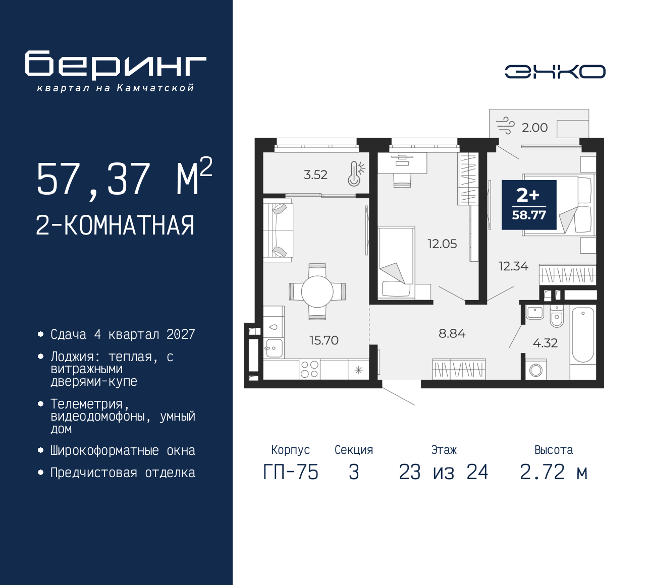 2-комн. квартира с предчистовой отделкой в ЖК "Беринг" на 23 этаже. Общая площадь: 57.37 кв.м., жилая: 24.39 кв.м., площадь просторной кухни-столовой: 15.7 кв.м. Комнаты изолированные, все окна выходят на одну сторону. В квартире один балкон и одна лоджия, один совмещенный санузел. Высота потолков 2.72 м. Дом монолитный, многоподъездный, переменной этажности, от 17 до 24 этажей. Квартира находится в 3-й секции высотой 24 этажа в корпусе ГП-75. На этаже 6 квартир. В подъезде 2 пассажирских и 1 грузовой лифт. Окончание строительства - 4 квартал 2027 года. Оформление сделки по договору долевого участия. Подобно знаменитому исследователю, мы чувствуем себя первооткрывателями этой локации. Хотим показать новую суть места, сформировать для вас жизненный опыт, которого ещё не было. Беринг — район зелёного цвета. Беринг — район, который откроется вам с другой стороны. Впечатлит новым уровнем комфорта и качеством жизни. Беринг — открытие на карте города. Первый квартал расположен в районе Тура, в границах улиц: Камчатская – Западносибирская – Энтузиастов. Вокруг уже есть всё для того, чтобы ежедневная рутина была лишь частью жизни и не доставляла дискомфорта. Школы и детские сады, магазины и аптеки, поликлиника, места для семейного отдыха, пеших и велопрогулок, и даже рыбалки. Масштабное озеленение дворов — визитная карточка ЭНКО и ваш оазис спокойствия, чтобы отвлечься от повседневности. Раскидистые деревья, кустарники, травы и цветы — осталось остановиться, вдохнуть и расслабиться, глядя на эту природную красоту. Стилистика подъездов продолжает концепцию Беринга, вдохновлённого Камчаткой: сдержанный, но при этом впечатляющий дизайн соседствует с удобством и функциональностью. (AQID02529719)