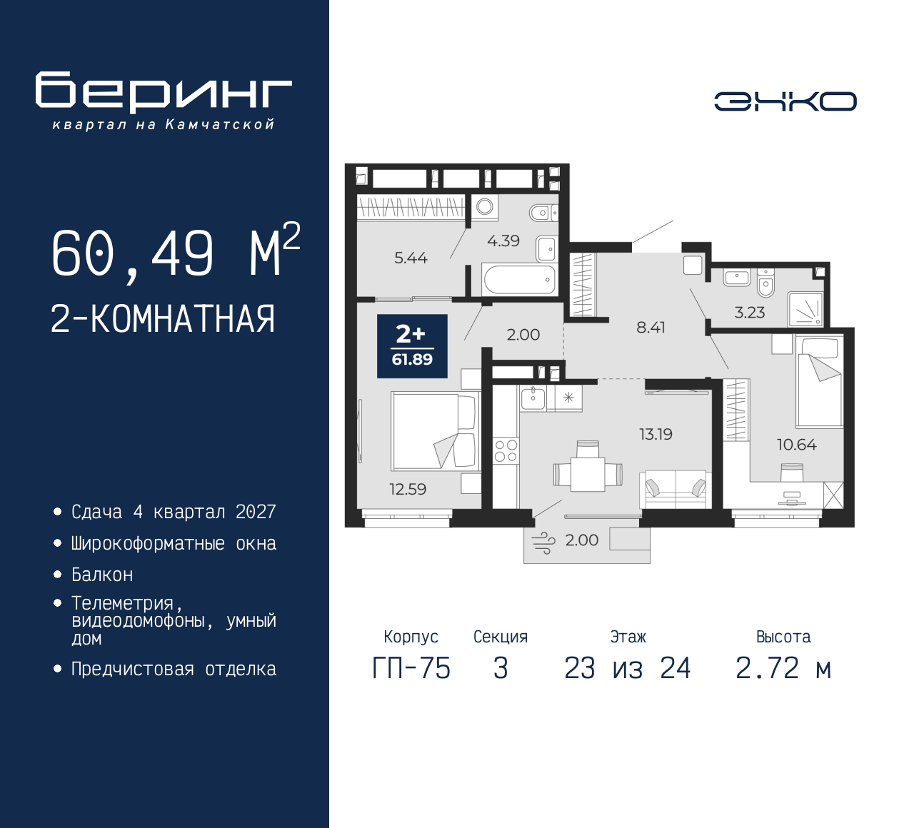 Продается двухкомнатная квартира с предчистовой отделкой в ЖК "Беринг" на 23 этаже. Общая площадь: 60.49 кв.м., жилая: 23.23 кв.м., площадь просторной кухни-столовой: 13.19 кв.м. Комнаты изолированные, все окна выходят на одну сторону. В квартире один балкон, два совмещенных санузла. Высота потолков 2.72 м. Дом монолитный, многоподъездный, переменной этажности, от 17 до 24 этажей. Квартира находится в 3-й секции высотой 24 этажа в корпусе ГП-75. На этаже 6 квартир. В подъезде 2 пассажирских и 1 грузовой лифт. Окончание строительства - 4 квартал 2027 года. Оформление сделки по договору долевого участия. Подобно знаменитому исследователю, мы чувствуем себя первооткрывателями этой локации. Хотим показать новую суть места, сформировать для вас жизненный опыт, которого ещё не было. Беринг — район зелёного цвета. Беринг — район, который откроется вам с другой стороны. Впечатлит новым уровнем комфорта и качеством жизни. Беринг — открытие на карте города. Первый квартал расположен в районе Тура, в границах улиц: Камчатская – Западносибирская – Энтузиастов. Вокруг уже есть всё для того, чтобы ежедневная рутина была лишь частью жизни и не доставляла дискомфорта. Школы и детские сады, магазины и аптеки, поликлиника, места для семейного отдыха, пеших и велопрогулок, и даже рыбалки. Масштабное озеленение дворов — визитная карточка ЭНКО и ваш оазис спокойствия, чтобы отвлечься от повседневности. Раскидистые деревья, кустарники, травы и цветы — осталось остановиться, вдохнуть и расслабиться, глядя на эту природную красоту. Стилистика подъездов продолжает концепцию Беринга, вдохновлённого Камчаткой: сдержанный, но при этом впечатляющий дизайн соседствует с удобством и функциональностью. (AQID02529740)