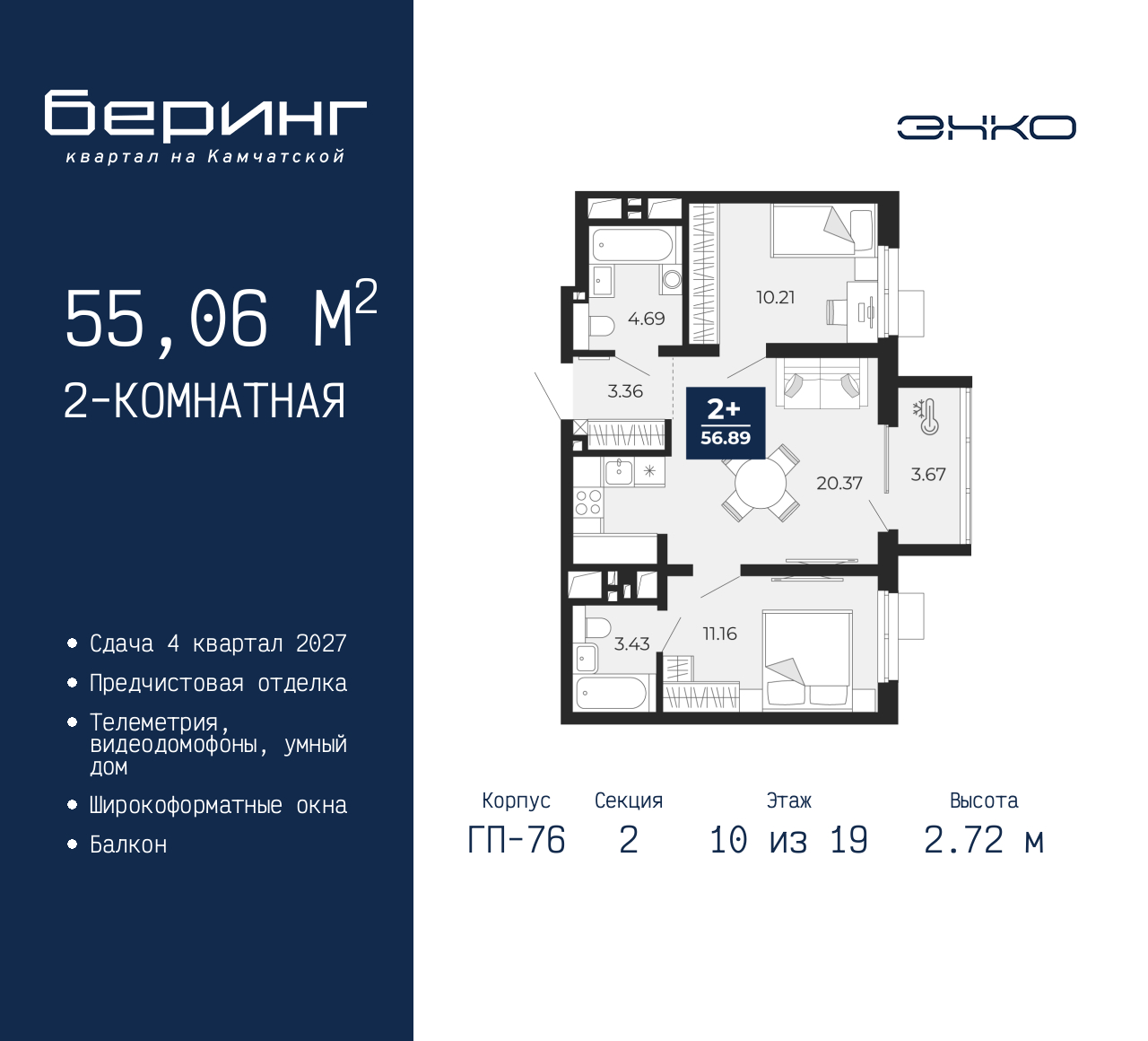 Двухкомнатная квартира с предчистовой отделкой в ЖК "Беринг" на 10 этаже. Общая площадь: 55.06 кв.м., жилая: 21.37 кв.м., площадь просторной кухни-столовой: 20.37 кв.м. Комнаты изолированные, все окна выходят на одну сторону. В квартире один балкон, два совмещенных санузла. Высота потолков 2.72 м. Дом монолитный, черырехподъездный, переменной этажности, от 19 до 24 этажей. Квартира находится во 2-й секции высотой 19 этажей в корпусе ГП-76. На этаже 8 квартир. В подъезде 1 пассажирский и 1 грузовой лифт. Окончание строительства - 4 квартал 2027 года. Оформление сделки по договору долевого участия. Подобно знаменитому исследователю, мы чувствуем себя первооткрывателями этой локации. Хотим показать новую суть места, сформировать для вас жизненный опыт, которого ещё не было. Беринг — район зелёного цвета. Беринг — район, который откроется вам с другой стороны. Впечатлит новым уровнем комфорта и качеством жизни. Беринг — открытие на карте города. Первый квартал расположен в районе Тура, в границах улиц: Камчатская – Западносибирская – Энтузиастов. Вокруг уже есть всё для того, чтобы ежедневная рутина была лишь частью жизни и не доставляла дискомфорта. Школы и детские сады, магазины и аптеки, поликлиника, места для семейного отдыха, пеших и велопрогулок, и даже рыбалки. Масштабное озеленение дворов — визитная карточка ЭНКО и ваш оазис спокойствия, чтобы отвлечься от повседневности. Раскидистые деревья, кустарники, травы и цветы — осталось остановиться, вдохнуть и расслабиться, глядя на эту природную красоту. Стилистика подъездов продолжает концепцию Беринга, вдохновлённого Камчаткой: сдержанный, но при этом впечатляющий дизайн соседствует с удобством и функциональностью. (AQID02518121)