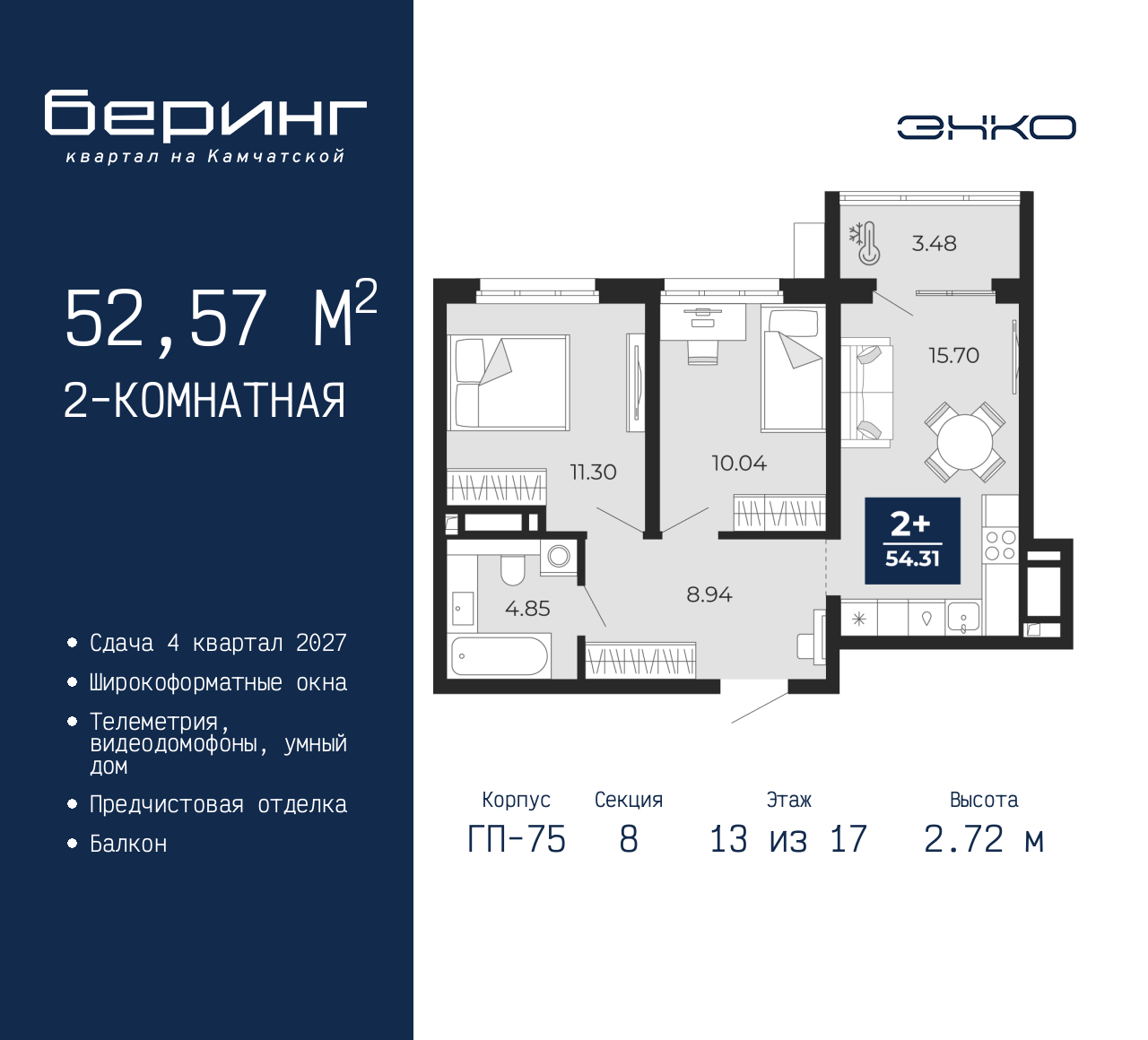 2-комн. квартира с предчистовой отделкой в ЖК "Беринг" на 13 этаже. Общая площадь: 52.57 кв.м., жилая: 21.34 кв.м., площадь просторной кухни-столовой: 15.7 кв.м. Комнаты изолированные, все окна выходят на одну сторону. В квартире один балкон, один совмещенный санузел. Высота потолков 2.72 м. Дом монолитный, многоподъездный, переменной этажности, от 17 до 24 этажей. Квартира находится в 8-й секции высотой 17 этажей в корпусе ГП-75. На этаже 8 квартир. В подъезде 2 пассажирских и 1 грузовой лифт. Окончание строительства - 4 квартал 2027 года. Оформление сделки по договору долевого участия. Подобно знаменитому исследователю, мы чувствуем себя первооткрывателями этой локации. Хотим показать новую суть места, сформировать для вас жизненный опыт, которого ещё не было. Беринг — район зелёного цвета. Беринг — район, который откроется вам с другой стороны. Впечатлит новым уровнем комфорта и качеством жизни. Беринг — открытие на карте города. Первый квартал расположен в районе Тура, в границах улиц: Камчатская – Западносибирская – Энтузиастов. Вокруг уже есть всё для того, чтобы ежедневная рутина была лишь частью жизни и не доставляла дискомфорта. Школы и детские сады, магазины и аптеки, поликлиника, места для семейного отдыха, пеших и велопрогулок, и даже рыбалки. Масштабное озеленение дворов — визитная карточка ЭНКО и ваш оазис спокойствия, чтобы отвлечься от повседневности. Раскидистые деревья, кустарники, травы и цветы — осталось остановиться, вдохнуть и расслабиться, глядя на эту природную красоту. Стилистика подъездов продолжает концепцию Беринга, вдохновлённого Камчаткой: сдержанный, но при этом впечатляющий дизайн соседствует с удобством и функциональностью. (AQID02529658)