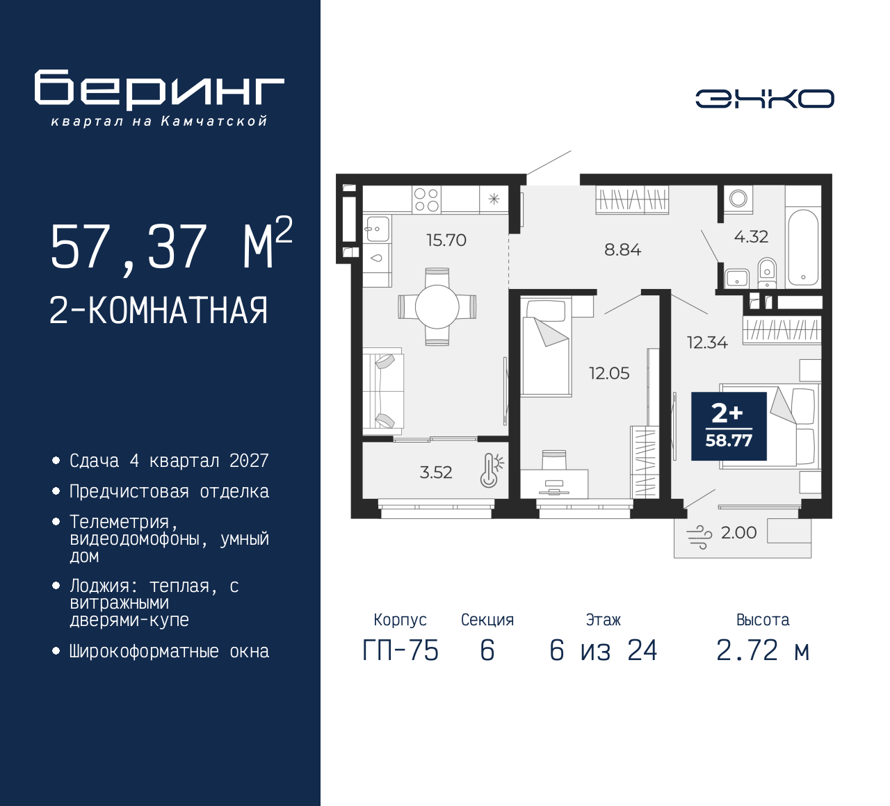 Просторная 2-комн. квартира с предчистовой отделкой в ЖК "Беринг" на 6 этаже. Общая площадь: 57.37 кв.м., жилая: 24.39 кв.м., площадь просторной кухни-столовой: 15.7 кв.м. Комнаты изолированные, все окна выходят на одну сторону. В квартире один балкон и одна лоджия, один совмещенный санузел. Высота потолков 2.72 м. Дом монолитный, многоподъездный, переменной этажности, от 17 до 24 этажей. Квартира находится в 6-й секции высотой 24 этажа в корпусе ГП-75. На этаже 6 квартир. В подъезде 2 пассажирских и 1 грузовой лифт. Окончание строительства - 4 квартал 2027 года. Оформление сделки по договору долевого участия. Подобно знаменитому исследователю, мы чувствуем себя первооткрывателями этой локации. Хотим показать новую суть места, сформировать для вас жизненный опыт, которого ещё не было. Беринг — район зелёного цвета. Беринг — район, который откроется вам с другой стороны. Впечатлит новым уровнем комфорта и качеством жизни. Беринг — открытие на карте города. Первый квартал расположен в районе Тура, в границах улиц: Камчатская – Западносибирская – Энтузиастов. Вокруг уже есть всё для того, чтобы ежедневная рутина была лишь частью жизни и не доставляла дискомфорта. Школы и детские сады, магазины и аптеки, поликлиника, места для семейного отдыха, пеших и велопрогулок, и даже рыбалки. Масштабное озеленение дворов — визитная карточка ЭНКО и ваш оазис спокойствия, чтобы отвлечься от повседневности. Раскидистые деревья, кустарники, травы и цветы — осталось остановиться, вдохнуть и расслабиться, глядя на эту природную красоту. Стилистика подъездов продолжает концепцию Беринга, вдохновлённого Камчаткой: сдержанный, но при этом впечатляющий дизайн соседствует с удобством и функциональностью. (AQID02529693)