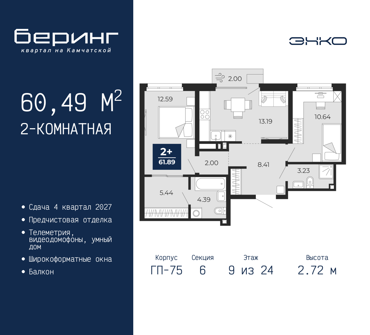 Продается двухкомнатная квартира с предчистовой отделкой в ЖК "Беринг" на 9 этаже. Общая площадь: 60.49 кв.м., жилая: 23.23 кв.м., площадь просторной кухни-столовой: 13.19 кв.м. Комнаты изолированные, все окна выходят на одну сторону. В квартире один балкон, два совмещенных санузла. Высота потолков 2.72 м. Дом монолитный, многоподъездный, переменной этажности, от 17 до 24 этажей. Квартира находится в 6-й секции высотой 24 этажа в корпусе ГП-75. На этаже 6 квартир. В подъезде 2 пассажирских и 1 грузовой лифт. Окончание строительства - 4 квартал 2027 года. Оформление сделки по договору долевого участия. Подобно знаменитому исследователю, мы чувствуем себя первооткрывателями этой локации. Хотим показать новую суть места, сформировать для вас жизненный опыт, которого ещё не было. Беринг — район зелёного цвета. Беринг — район, который откроется вам с другой стороны. Впечатлит новым уровнем комфорта и качеством жизни. Беринг — открытие на карте города. Первый квартал расположен в районе Тура, в границах улиц: Камчатская – Западносибирская – Энтузиастов. Вокруг уже есть всё для того, чтобы ежедневная рутина была лишь частью жизни и не доставляла дискомфорта. Школы и детские сады, магазины и аптеки, поликлиника, места для семейного отдыха, пеших и велопрогулок, и даже рыбалки. Масштабное озеленение дворов — визитная карточка ЭНКО и ваш оазис спокойствия, чтобы отвлечься от повседневности. Раскидистые деревья, кустарники, травы и цветы — осталось остановиться, вдохнуть и расслабиться, глядя на эту природную красоту. Стилистика подъездов продолжает концепцию Беринга, вдохновлённого Камчаткой: сдержанный, но при этом впечатляющий дизайн соседствует с удобством и функциональностью. (AQID02529728)