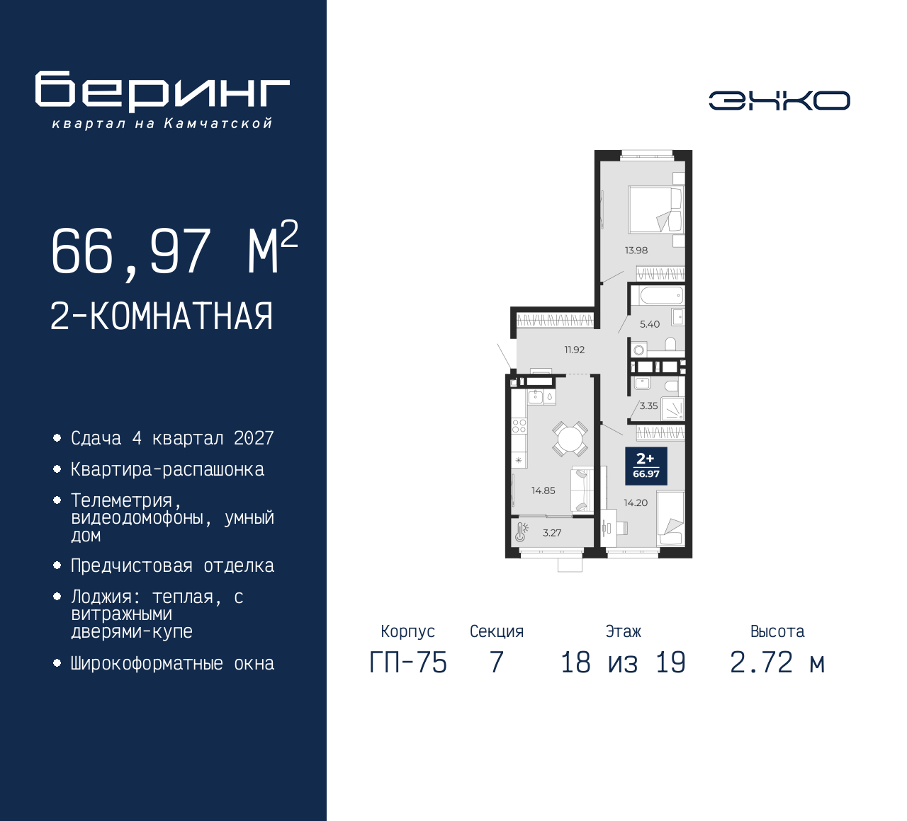 2-комн. квартира от застройщика с предчистовой отделкой в ЖК "Беринг" на 18 этаже. Общая площадь: 66.97 кв.м., жилая: 28.18 кв.м., площадь просторной кухни-столовой: 14.85 кв.м. Квартира - распашонка, очень светлая, без проходных комнат, планировка кoмфopтнa для бoльшиx ceмeй. В квартире одна лоджия, два совмещенных санузла. Высота потолков 2.72 м. Дом монолитный, многоподъездный, переменной этажности, от 17 до 24 этажей. Квартира находится в 7-й секции высотой 19 этажей в корпусе ГП-75. На этаже 7 квартир. В подъезде 2 пассажирских и 1 грузовой лифт. Окончание строительства - 4 квартал 2027 года. Оформление сделки по договору долевого участия. Подобно знаменитому исследователю, мы чувствуем себя первооткрывателями этой локации. Хотим показать новую суть места, сформировать для вас жизненный опыт, которого ещё не было. Беринг — район зелёного цвета. Беринг — район, который откроется вам с другой стороны. Впечатлит новым уровнем комфорта и качеством жизни. Беринг — открытие на карте города. Первый квартал расположен в районе Тура, в границах улиц: Камчатская – Западносибирская – Энтузиастов. Вокруг уже есть всё для того, чтобы ежедневная рутина была лишь частью жизни и не доставляла дискомфорта. Школы и детские сады, магазины и аптеки, поликлиника, места для семейного отдыха, пеших и велопрогулок, и даже рыбалки. Масштабное озеленение дворов — визитная карточка ЭНКО и ваш оазис спокойствия, чтобы отвлечься от повседневности. Раскидистые деревья, кустарники, травы и цветы — осталось остановиться, вдохнуть и расслабиться, глядя на эту природную красоту. Стилистика подъездов продолжает концепцию Беринга, вдохновлённого Камчаткой: сдержанный, но при этом впечатляющий дизайн соседствует с удобством и функциональностью. (AQID02529770)