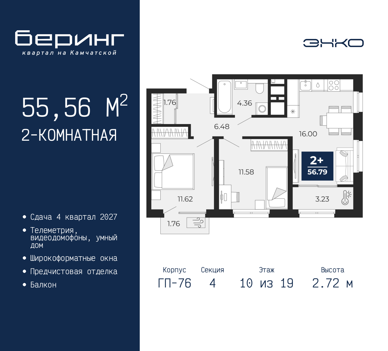 - Общая площадь 55.56 м²