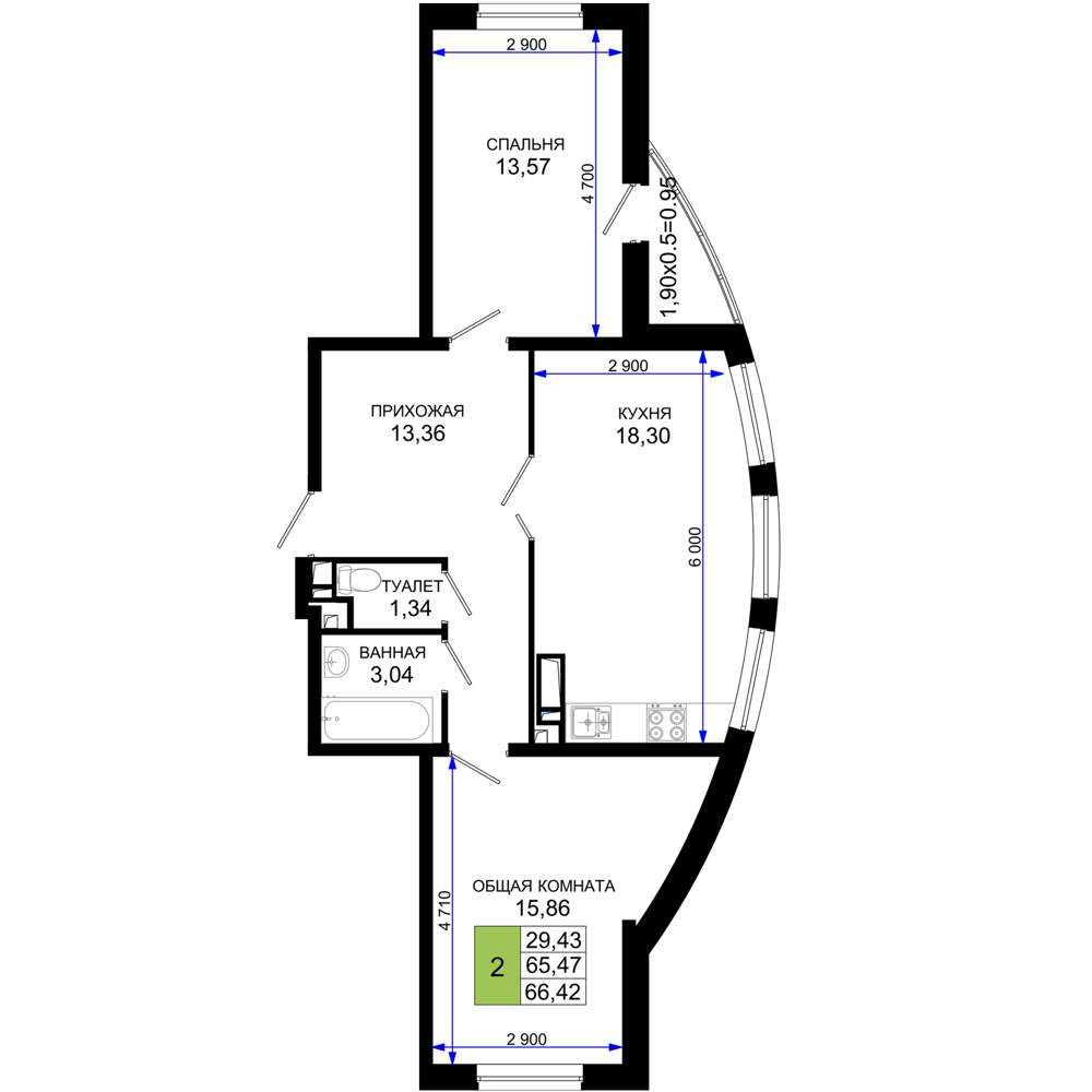 Квартира 2-комн., 66 м2, 18/19 этаж,