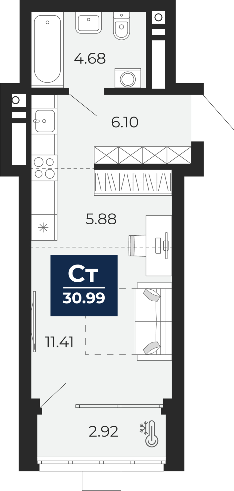 Однокомнатная квартира-студия от застройщика с предчистовой отделкой в ЖК "Соната Парк" на 15 этаже. Общая площадь: 29.53 кв.м., площадь гостиной 17.29 кв.м., из которых 5.88 кв.м. выделено под кухонную зону. Все окна выходят на одну сторону. В квартире один балкон, один совмещенный санузел. Высота потолков 2.72 м. Дом монолитный, двухподъездный, переменной этажности, от 23 до 30 этажей. Квартира находится во 2-й секции высотой 23 этажа в корпусе 1. На этаже 11 квартир. В подъезде 1 пассажирский и 2 грузовых лифта. Окончание строительства - 4 квартал 2028 года. Оформление сделки по договору долевого участия. ЖК «Соната Парк» расположен в новом городском кластере «Аллея Романтиков» на Юго-Западе Екатеринбурга. Это район улиц Волгоградская – Советских женщин – Шаумяна – Амудсена. Аллея объединяет разные кварталы застройщиков этой территории в единое целое. Чистые линии, интеллектуальная элегантность фасадов, игра света и тени – это партитура, написанная архитектором. Благоустройство жилого комплекса – это синтез искусства и природы. Поющие музыкальные инсталляции и поэтический променад. Оркестр растений: сирень, гортензии и яблони, чья цветущая палитра сменяется в течение года. 1005 квартир: от студий 31 м² до 4-комнатных 99 м². С опциями для комфортной жизни: высокие потолки до 3 м, гардеробные даже в 1-комнатных, террасы и зимние сады. Жизнь с готовой инфраструктурой Развитая транспортная доступность и социальная среда: уже сегодня рядом с домом – детские сады, школы, парковые зоны, супермаркеты и рестораны в шаговой доступности. Технологии безопасности Для спокойствия жителей создана интеллектуальная система безопасности. Круглосуточный визуальный контроль обеспечивают профессиональная служба охраны, постоянно присутствующая на территории, и ситуационный центр. Система видеонаблюдения охватывает каждый уголок комплекса, исключая «слепые» зоны. Чёткое зонирование и навигация дополняют картину полного порядка. Дизайнерские подъезды Стилистика подъездов продолжает концепцию «Соната Парка», вдохновлённого музыкальной симфонией: сдержанный, но при этом впечатляющий дизайн соседствует с удобством и функциональностью. В подъезде вас встречает музыка, создавая особую атмосферу с первых секунд. Светлые и стильные входные группы с панорамным остеклением наполняют пространство светом, добавляя ему современной эстетики и ощущения безопасности. Аллея Романтиков Проект органично вписан в масштабный пешеходный кластер «Аллея Романтиков» — уникальное общегородское пространство, которое уже сегодня называют будущей альтернативой главным прогулочным улицам города. Это многофункциональный бульвар протяжённостью 1 километр, где всё создано для вдохновения и отдыха. Это «зелёное сердце» территории, которое объединит кварталы разных застройщиков в единую гармоничную среду. Здесь будут назначать свидания, гулять с семьёй, встречаться с друзьями и просто наслаждаться моментом. Линейка ремонтов Ремонт с капсульной меблировкой — когда всё готово к жизни. Мы соединили качественный ремонт и продуманную меблировку в одном флаконе. Словно «с иголочки», новая квартира готова и обставлена с чувством стиля и вкуса. Здесь будет всё до последней мелочи: от дивана до чайника, от освещения до текстиля. Переступите порог и моментально ощутите себя дома. Особе