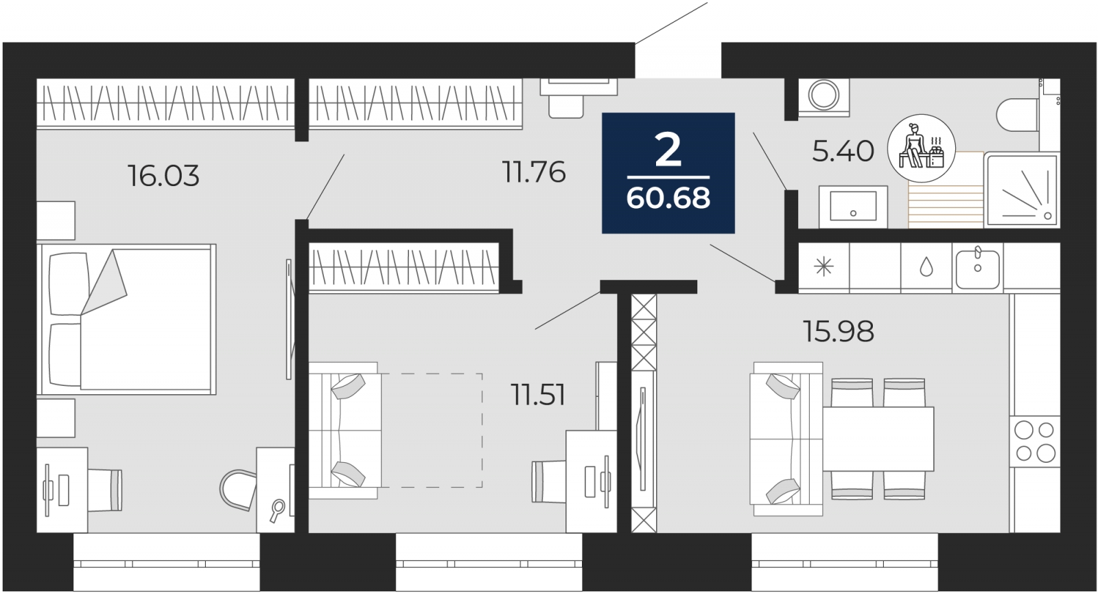 - Общая площадь 60.68 м²