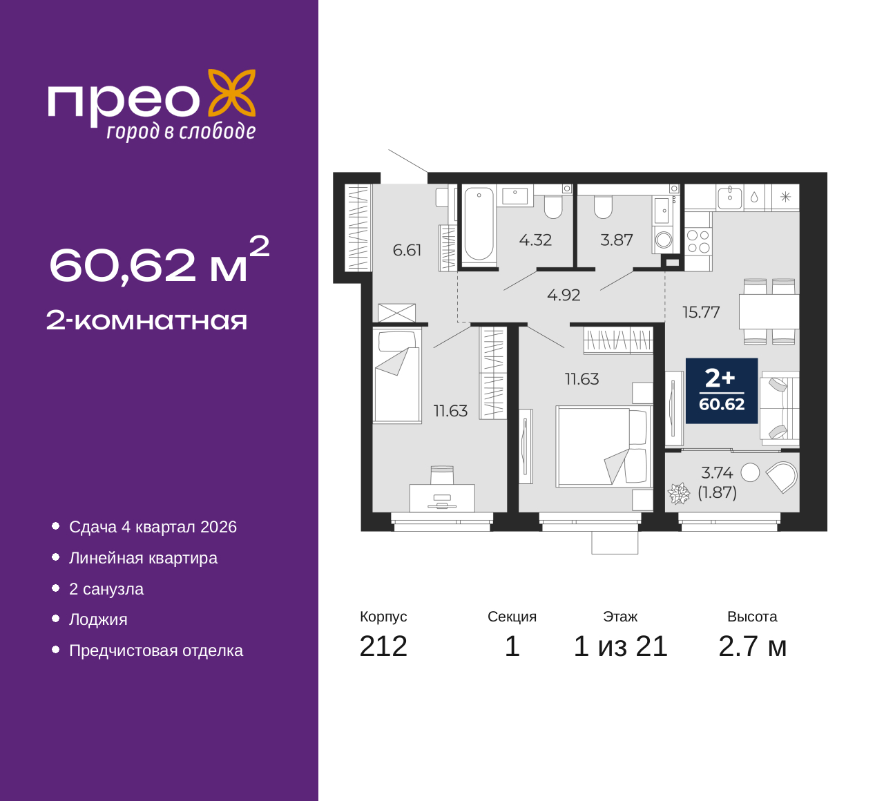 - Общая площадь 60.62 м²