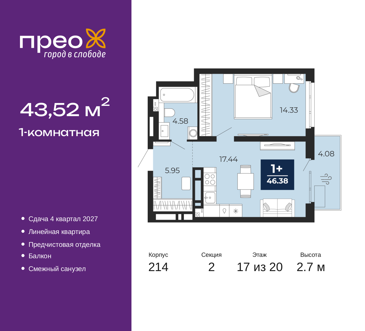 Продается 1-комн. квартира от застройщика с предчистовой отделкой в ЖК "Прео" на 17 этаже. Общая площадь: 43.52 кв.м., жилая: 14.33 кв.м., площадь просторной кухни-столовой: 17.44 кв.м. Все окна выходят на одну сторону. В квартире один балкон, один совмещенный санузел. Высота потолков 2.7 м. Дом монолитный, двухподъездный, переменной этажности, от 12 до 20 этажей. Квартира находится во 2-й секции высотой 20 этажей в корпусе 214. На этаже 8 квартир. В подъезде 1 пассажирский и 1 грузовой лифт. Окончание строительства - 4 квартал 2027 года. Оформление сделки по договору долевого участия. Преображенский — один из самых привлекательных районов для жизни! Это полностью самостоятельный жилой район с точки зрения инфраструктуры. Преображенский находится между Московским и Червишевским трактами в квартале улиц Закалужская — Вьюжная — Александра Протозанова. Не нужно ждать, когда появится инфраструктура — переезжайте на всё готовое. Вблизи расположены действующие школа и детский сад. В этом году откроется еще один сад, а в следующем году — школа. По соседству с Преображенским запланировано строительство городского парка «Комарово» площадью 38 гектар. За 10 минут можно доехать на автомобиле до крупных ТРЦ: «Лента», «Кристалл», «Леруа Мерлен», «Метро» и «Ашан». С 2018 года в районе открыт Соседский центр — пространство, созданное для формирования добрососедской среды, совместного досуга, общения и реализации соседских инициатив. Здесь проходят встречи соседей, а также сами жители района организовывают мероприятия. Организатором такого события может стать любой желающий. В квартирах выполнена качественная предчистовая отделка. Гладкие стены с финишным выравниванием по маякам. Ровный потолок для установки натяжного потолка. Установлены пятикамерные окна с двойным стеклопакетом (3 стекла). Дизайнерские холлы с видеонаблюдением, безбарьерным и прозрачным входом – всегда светло и спокойно. На первом этаже есть просторные колясочные, где все жители могут оставлять свои коляски и велосипеды. В Преображенском есть всё, что нужно для активного отдыха и занятий спортом. Мы сделали большое футбольное поле с безопасным покрытием. Также установили хоккейный корт, который оборудован по всем необходимым стандартам. Во дворах можно делать упражнения на специальных площадках с турниками. Весь район мы обустроили велодорожками, которые связаны в единый маршрут. У нас есть сухие фонтаны, бьющие из земли, деревья, веревки, сетки, скалодром, газон, песок и резинка — осталось просто дать своему ребенку право на свободную игру. По-настоящему хорошие дворы — это те, которые дети предпочитают соцсетям и телевизору. Аккредитация в банках: «Сбербанк России», ПАО «Банк Уралсиб», ПАО «Газпромбанк», ПАО Банк «ВТБ», ОАО «Альфа-Банк» и других. (AQID02525497)
