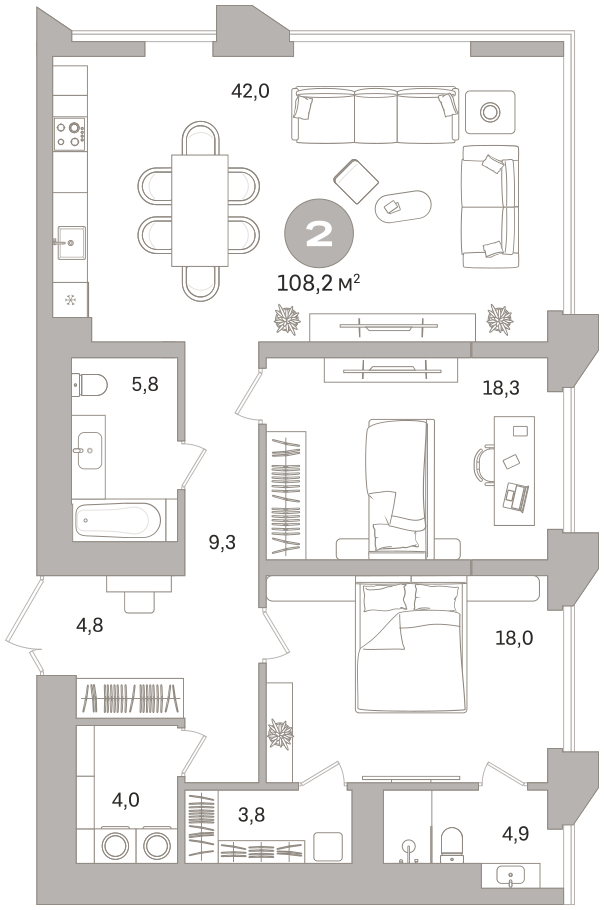 Двухкомнатная квартира с предчистовой отделкой в ЖК «Гоголя 21" на 9 этаже. Общая площадь: 108.18 кв.м., жилая: 36.3 кв.м., площадь просторной кухни-столовой: 42 кв.м. Угловая квартира, очень светлая, естественная вентиляция при открытии окон. В квартире два совмещенных санузла. Высота потолков 2.98 м. Дом монолитный, двухподъездный, переменной этажности, от 21 до 25 этажей. Квартира находится в 1-й секции высотой 25 этажей в корпусе 1. На этаже 5 квартир. В подъезде 2 пассажирских и 1 грузовой лифт. Начало строительства - 3 квартал 2025 года. Окончание строительства - 3 квартал 2028 года. Оформление сделки по договору долевого участия. Квартира с кухней-гостиной и двумя спальнями в проекте Гоголя 21. Особенности планировки: свободная планировка. № квартиры в нашей базе: ЗНГ01-Ж1.9.6. (AQID02531277)