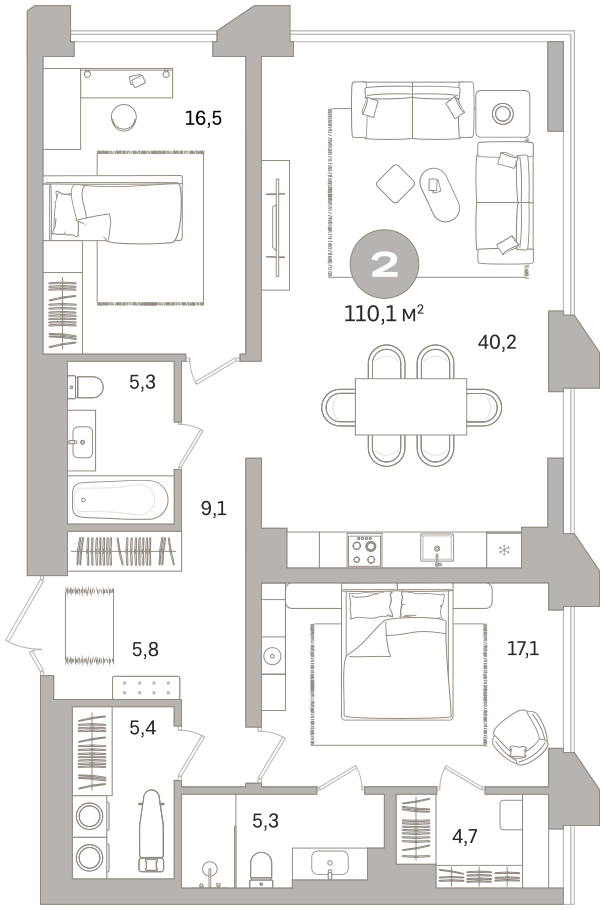 2-комн. квартира от застройщика с предчистовой отделкой в ЖК «Гоголя 21" на 5 этаже. Общая площадь: 110.14 кв.м., жилая: 33.6 кв.м., площадь просторной кухни-столовой: 40.2 кв.м. Квартира угловая, очень светлая, естественная вентиляция при открытии окон. В квартире два совмещенных санузла. Высота потолков 2.98 м. Дом монолитный, двухподъездный, переменной этажности, от 21 до 25 этажей. Квартира находится во 2-й секции высотой 21 этаж в корпусе 1. На этаже 4 квартиры. В подъезде 2 пассажирских и 1 грузовой лифт. Начало строительства - 3 квартал 2025 года. Окончание строительства - 3 квартал 2028 года. Оформление сделки по договору долевого участия. Квартира с кухней-гостиной и двумя спальнями в проекте Гоголя 21. Особенности планировки: свободная планировка. № квартиры в нашей базе: ЗНГ01-Ж2.5.3. (AQID02531294)