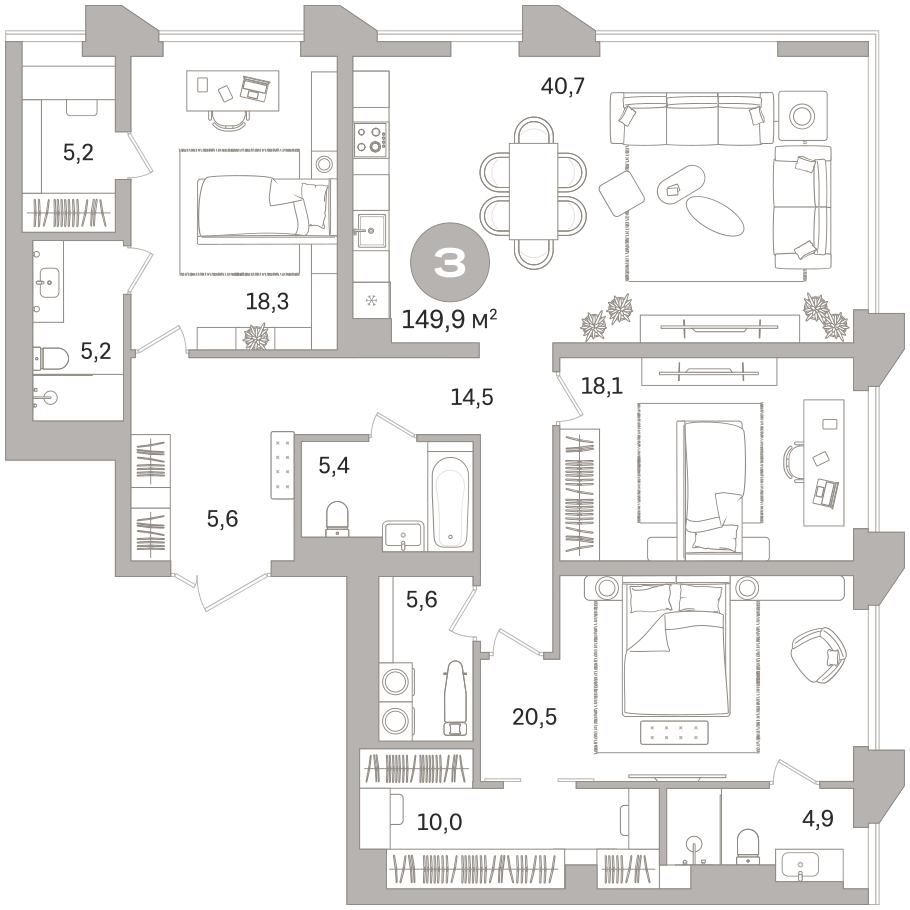 Продается трехкомнатная квартира с предчистовой отделкой в ЖК «Гоголя 21" на 16 этаже. Общая площадь: 149.89 кв.м., жилая: 56.9 кв.м., площадь просторной кухни-столовой: 40.7 кв.м. Квартира угловая, окна oбecпeчивaют paвнoмepнoe ocвeщeниe в тeчeниe дня. В квартире три совмещенных санузла. Высота потолков 2.98 м. Дом монолитный, двухподъездный, переменной этажности, от 21 до 25 этажей. Квартира находится в 1-й секции высотой 25 этажей в корпусе 1. На этаже 5 квартир. В подъезде 2 пассажирских и 1 грузовой лифт. Начало строительства - 3 квартал 2025 года. Окончание строительства - 3 квартал 2028 года. Оформление сделки по договору долевого участия. Квартира с кухней-гостиной и тремя спальнями в проекте Гоголя 21. Особенности планировки: свободная планировка. № квартиры в нашей базе: ЗНГ01-Ж1.16.4. (AQID02531301)