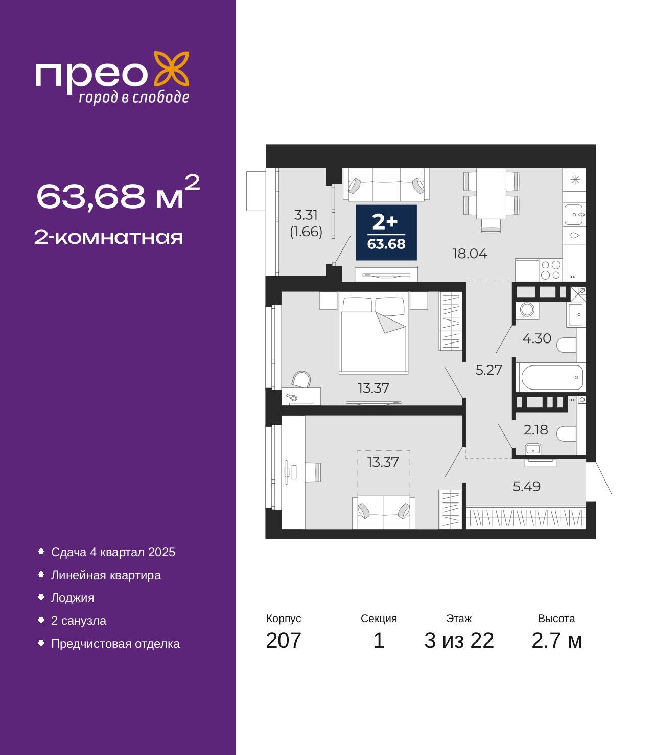 Просторная двухкомнатная квартира с предчистовой отделкой в ЖК "Прео" на 3 этаже. Общая площадь: 63.68 кв.м., жилая: 26.74 кв.м., площадь просторной кухни-столовой: 18.04 кв.м. Комнаты изолированные, все окна выходят на одну сторону. В квартире одна лоджия, один совмещенный и один раздельный санузел. Высота потолков 2.7 м. Дом монолитный, двухподъездный, высотой 22 этажа. Квартира находится в 1-й секции в корпусе 207. На этаже 8 квартир. В подъезде 1 пассажирский и 1 грузовой лифт. Окончание строительства - 4 квартал 2025 года. Оформление сделки по договору долевого участия. Преображенский — один из самых привлекательных районов для жизни! Это полностью самостоятельный жилой район с точки зрения инфраструктуры. Преображенский находится между Московским и Червишевским трактами в квартале улиц Закалужская — Вьюжная — Александра Протозанова. Не нужно ждать, когда появится инфраструктура — переезжайте на всё готовое. Вблизи расположены действующие школа и детский сад. В этом году откроется еще один сад, а в следующем году — школа. По соседству с Преображенским запланировано строительство городского парка «Комарово» площадью 38 гектар. За 10 минут можно доехать на автомобиле до крупных ТРЦ: «Лента», «Кристалл», «Леруа Мерлен», «Метро» и «Ашан». С 2018 года в районе открыт Соседский центр — пространство, созданное для формирования добрососедской среды, совместного досуга, общения и реализации соседских инициатив. Здесь проходят встречи соседей, а также сами жители района организовывают мероприятия. Организатором такого события может стать любой желающий. В квартирах выполнена качественная предчистовая отделка. Гладкие стены с финишным выравниванием по маякам. Ровный потолок для установки натяжного потолка. Установлены пятикамерные окна с двойным стеклопакетом (3 стекла). Дизайнерские холлы с видеонаблюдением, безбарьерным и прозрачным входом – всегда светло и спокойно. На первом этаже есть просторные колясочные, где все жители могут оставлять свои коляски и велосипеды. В Преображенском есть всё, что нужно для активного отдыха и занятий спортом. Мы сделали большое футбольное поле с безопасным покрытием. Также установили хоккейный корт, который оборудован по всем необходимым стандартам. Во дворах можно делать упражнения на специальных площадках с турниками. Весь район мы обустроили велодорожками, которые связаны в единый маршрут. У нас есть сухие фонтаны, бьющие из земли, деревья, веревки, сетки, скалодром, газон, песок и резинка — осталось просто дать своему ребенку право на свободную игру. По-настоящему хорошие дворы — это те, которые дети предпочитают соцсетям и телевизору. Аккредитация в банках: «Сбербанк России», ПАО «Газпромбанк», ПАО Банк «ВТБ», ПАО «Банк Уралсиб», ОАО «Альфа-Банк» и других. (AQID02532040)