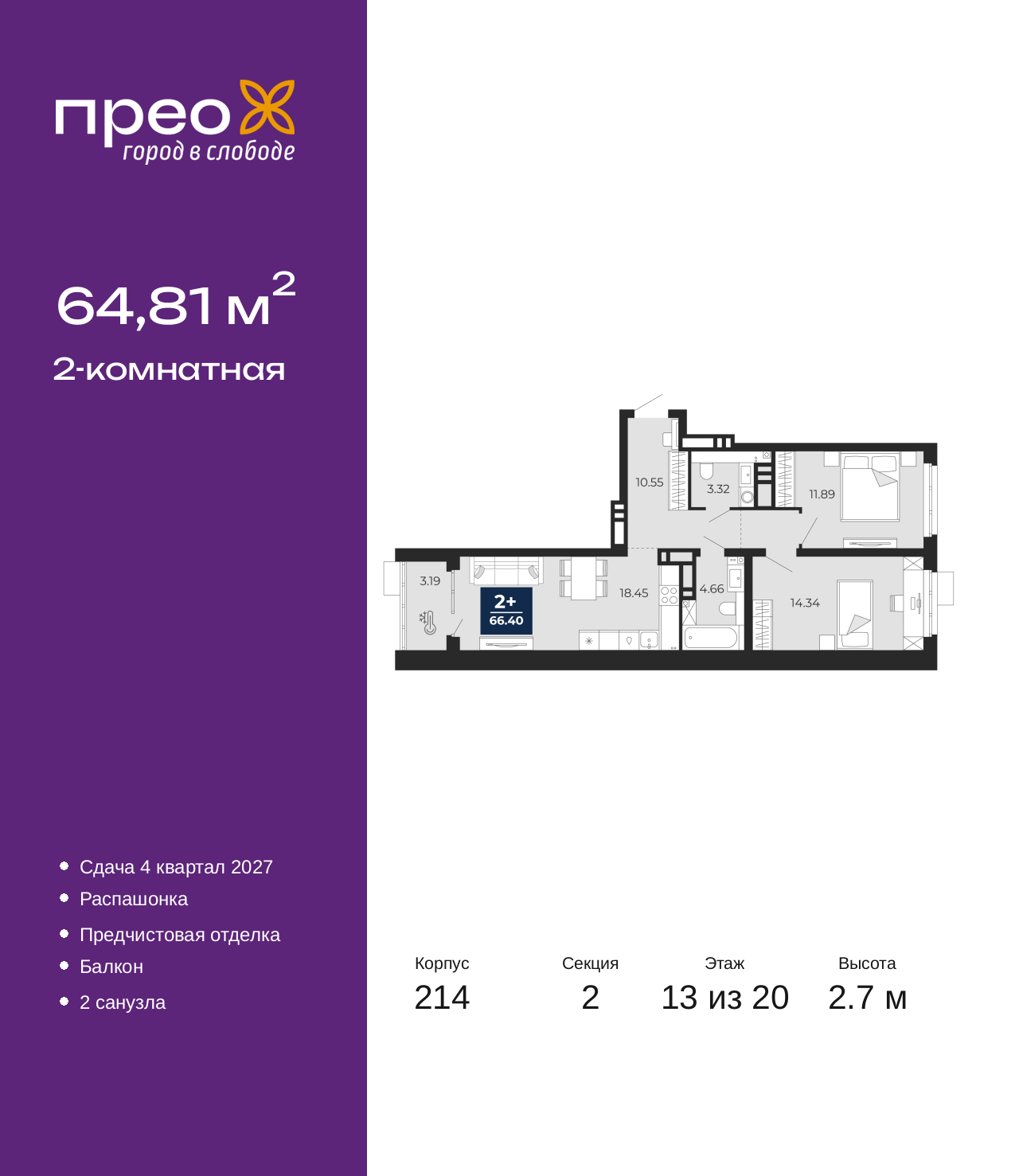 Двухкомнатная квартира с предчистовой отделкой в ЖК "Прео" на 13 этаже. Общая площадь: 64.81 кв.м., жилая: 26.23 кв.м., площадь просторной кухни-столовой: 18.45 кв.м. Квартира - распашонка, без проходных комнат, окна выходят на paзные стороны дома. В квартире один балкон, один совмещенный и один раздельный санузел. Высота потолков 2.7 м. Дом монолитный, двухподъездный, переменной этажности, от 12 до 20 этажей. Квартира находится во 2-й секции высотой 20 этажей в корпусе 214. На этаже 8 квартир. В подъезде 1 пассажирский и 1 грузовой лифт. Окончание строительства - 4 квартал 2027 года. Оформление сделки по договору долевого участия. Преображенский — один из самых привлекательных районов для жизни! Это полностью самостоятельный жилой район с точки зрения инфраструктуры. Преображенский находится между Московским и Червишевским трактами в квартале улиц Закалужская — Вьюжная — Александра Протозанова. Не нужно ждать, когда появится инфраструктура — переезжайте на всё готовое. Вблизи расположены действующие школа и детский сад. В этом году откроется еще один сад, а в следующем году — школа. По соседству с Преображенским запланировано строительство городского парка «Комарово» площадью 38 гектар. За 10 минут можно доехать на автомобиле до крупных ТРЦ: «Лента», «Кристалл», «Леруа Мерлен», «Метро» и «Ашан». С 2018 года в районе открыт Соседский центр — пространство, созданное для формирования добрососедской среды, совместного досуга, общения и реализации соседских инициатив. Здесь проходят встречи соседей, а также сами жители района организовывают мероприятия. Организатором такого события может стать любой желающий. В квартирах выполнена качественная предчистовая отделка. Гладкие стены с финишным выравниванием по маякам. Ровный потолок для установки натяжного потолка. Установлены пятикамерные окна с двойным стеклопакетом (3 стекла). Дизайнерские холлы с видеонаблюдением, безбарьерным и прозрачным входом – всегда светло и спокойно. На первом этаже есть просторные колясочные, где все жители могут оставлять свои коляски и велосипеды. В Преображенском есть всё, что нужно для активного отдыха и занятий спортом. Мы сделали большое футбольное поле с безопасным покрытием. Также установили хоккейный корт, который оборудован по всем необходимым стандартам. Во дворах можно делать упражнения на специальных площадках с турниками. Весь район мы обустроили велодорожками, которые связаны в единый маршрут. У нас есть сухие фонтаны, бьющие из земли, деревья, веревки, сетки, скалодром, газон, песок и резинка — осталось просто дать своему ребенку право на свободную игру. По-настоящему хорошие дворы — это те, которые дети предпочитают соцсетям и телевизору. Аккредитация в банках: ПАО Банк «ВТБ», ОАО «Альфа-Банк», «Сбербанк России», ПАО «Газпромбанк», ПАО «Банк Уралсиб» и других. (AQID02525598)