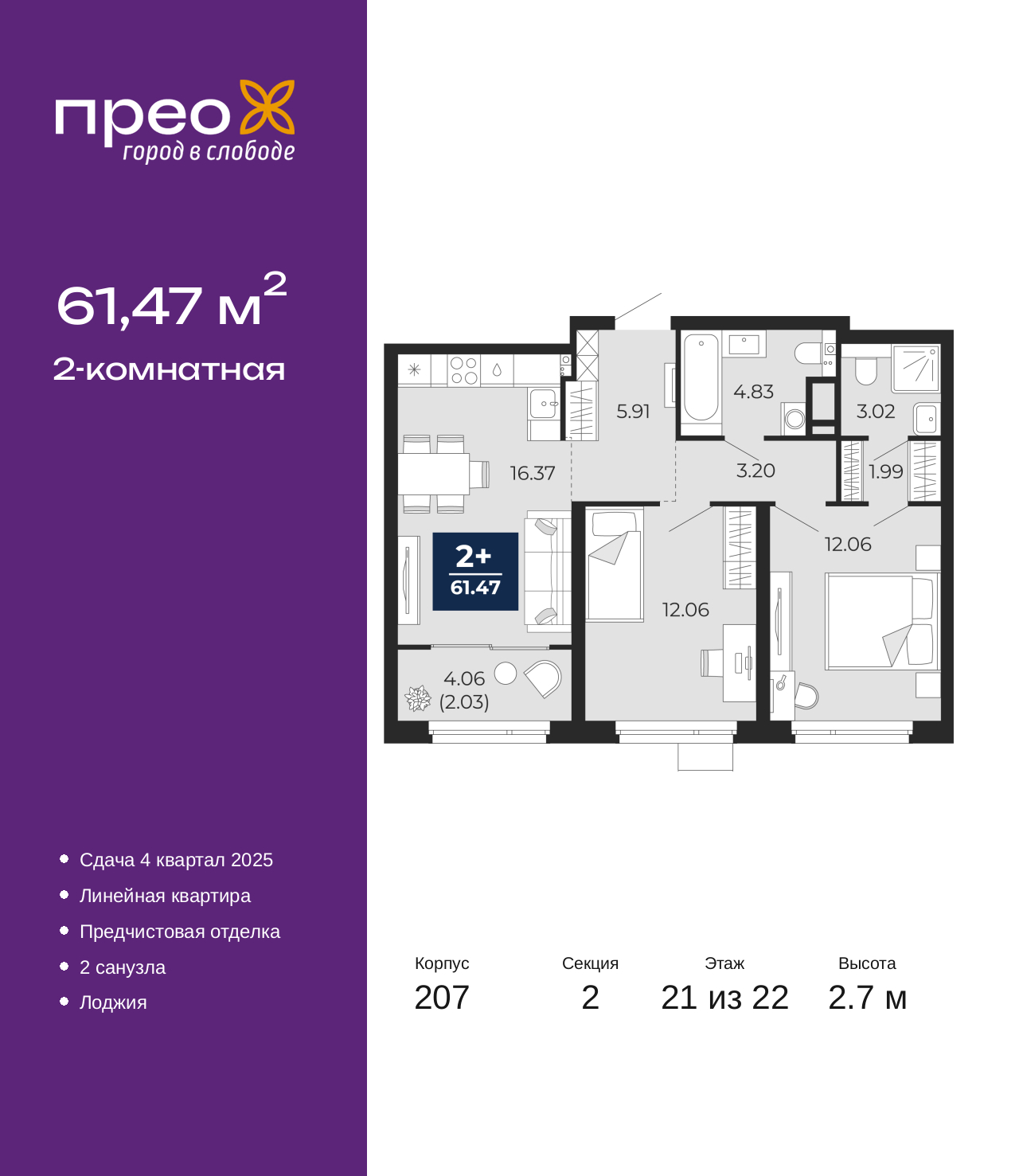 Продается двухкомнатная квартира с предчистовой отделкой в ЖК "Прео" на 21 этаже. Общая площадь: 61.47 кв.м., жилая: 24.12 кв.м., площадь просторной кухни-столовой: 16.37 кв.м. Комнаты изолированные, все окна выходят на одну сторону. В квартире одна лоджия, два совмещенных санузла. Высота потолков 2.7 м. Дом монолитный, двухподъездный, высотой 22 этажа. Квартира находится во 2-й секции в корпусе 207. На этаже 8 квартир. В подъезде 1 пассажирский и 1 грузовой лифт. Окончание строительства - 4 квартал 2025 года. Оформление сделки по договору долевого участия. Преображенский — один из самых привлекательных районов для жизни! Это полностью самостоятельный жилой район с точки зрения инфраструктуры. Преображенский находится между Московским и Червишевским трактами в квартале улиц Закалужская — Вьюжная — Александра Протозанова. Не нужно ждать, когда появится инфраструктура — переезжайте на всё готовое. Вблизи расположены действующие школа и детский сад. В этом году откроется еще один сад, а в следующем году — школа. По соседству с Преображенским запланировано строительство городского парка «Комарово» площадью 38 гектар. За 10 минут можно доехать на автомобиле до крупных ТРЦ: «Лента», «Кристалл», «Леруа Мерлен», «Метро» и «Ашан». С 2018 года в районе открыт Соседский центр — пространство, созданное для формирования добрососедской среды, совместного досуга, общения и реализации соседских инициатив. Здесь проходят встречи соседей, а также сами жители района организовывают мероприятия. Организатором такого события может стать любой желающий. В квартирах выполнена качественная предчистовая отделка. Гладкие стены с финишным выравниванием по маякам. Ровный потолок для установки натяжного потолка. Установлены пятикамерные окна с двойным стеклопакетом (3 стекла). Дизайнерские холлы с видеонаблюдением, безбарьерным и прозрачным входом – всегда светло и спокойно. На первом этаже есть просторные колясочные, где все жители могут оставлять свои коляски и велосипеды. В Преображенском есть всё, что нужно для активного отдыха и занятий спортом. Мы сделали большое футбольное поле с безопасным покрытием. Также установили хоккейный корт, который оборудован по всем необходимым стандартам. Во дворах можно делать упражнения на специальных площадках с турниками. Весь район мы обустроили велодорожками, которые связаны в единый маршрут. У нас есть сухие фонтаны, бьющие из земли, деревья, веревки, сетки, скалодром, газон, песок и резинка — осталось просто дать своему ребенку право на свободную игру. По-настоящему хорошие дворы — это те, которые дети предпочитают соцсетям и телевизору. (AQID02525846)