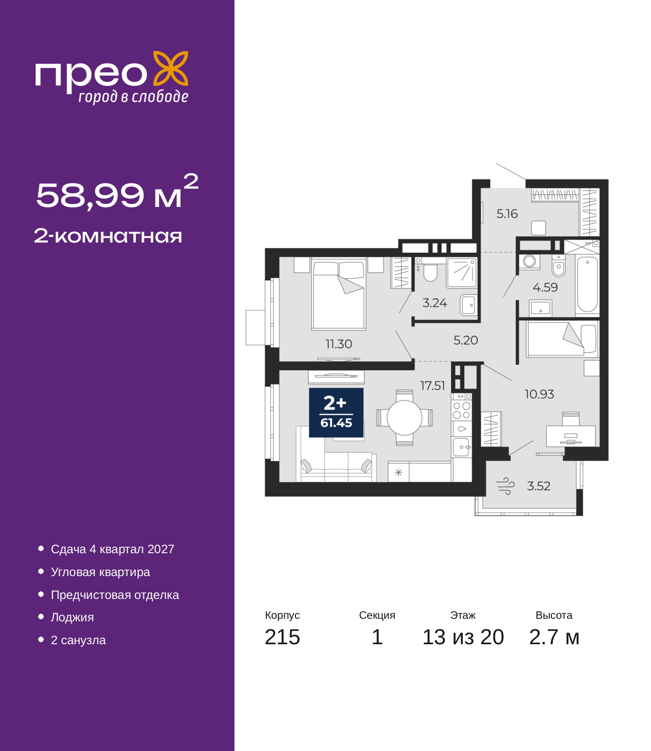 Продается 2-комн. квартира от застройщика с предчистовой отделкой в ЖК "Прео" на 13 этаже. Общая площадь: 58.99 кв.м., жилая: 22.23 кв.м., площадь просторной кухни-столовой: 17.51 кв.м. Квартира угловая, очень светлая, естественная вентиляция при открытии окон. В квартире одна лоджия, два совмещенных санузла. Высота потолков 2.7 м. Квартира находится в корпусе 215. Дом монолитный, одноподъездный, высотой 20 этажей. На этаже 8 квартир. В подъезде 1 пассажирский и 1 грузовой лифт. Окончание строительства - 4 квартал 2027 года. Оформление сделки по договору долевого участия. Преображенский — один из самых привлекательных районов для жизни! Это полностью самостоятельный жилой район с точки зрения инфраструктуры. Преображенский находится между Московским и Червишевским трактами в квартале улиц Закалужская — Вьюжная — Александра Протозанова. Не нужно ждать, когда появится инфраструктура — переезжайте на всё готовое. Вблизи расположены действующие школа и детский сад. В этом году откроется еще один сад, а в следующем году — школа. По соседству с Преображенским запланировано строительство городского парка «Комарово» площадью 38 гектар. За 10 минут можно доехать на автомобиле до крупных ТРЦ: «Лента», «Кристалл», «Леруа Мерлен», «Метро» и «Ашан». С 2018 года в районе открыт Соседский центр — пространство, созданное для формирования добрососедской среды, совместного досуга, общения и реализации соседских инициатив. Здесь проходят встречи соседей, а также сами жители района организовывают мероприятия. Организатором такого события может стать любой желающий. В квартирах выполнена качественная предчистовая отделка. Гладкие стены с финишным выравниванием по маякам. Ровный потолок для установки натяжного потолка. Установлены пятикамерные окна с двойным стеклопакетом (3 стекла). Дизайнерские холлы с видеонаблюдением, безбарьерным и прозрачным входом – всегда светло и спокойно. На первом этаже есть просторные колясочные, где все жители могут оставлять свои коляски и велосипеды. В Преображенском есть всё, что нужно для активного отдыха и занятий спортом. Мы сделали большое футбольное поле с безопасным покрытием. Также установили хоккейный корт, который оборудован по всем необходимым стандартам. Во дворах можно делать упражнения на специальных площадках с турниками. Весь район мы обустроили велодорожками, которые связаны в единый маршрут. У нас есть сухие фонтаны, бьющие из земли, деревья, веревки, сетки, скалодром, газон, песок и резинка — осталось просто дать своему ребенку право на свободную игру. По-настоящему хорошие дворы — это те, которые дети предпочитают соцсетям и телевизору. Аккредитация в банках: ПАО «Банк Уралсиб», ПАО «Газпромбанк», ПАО Банк «ВТБ», ОАО «Альфа-Банк», «Сбербанк России» и других. (AQID02525569)