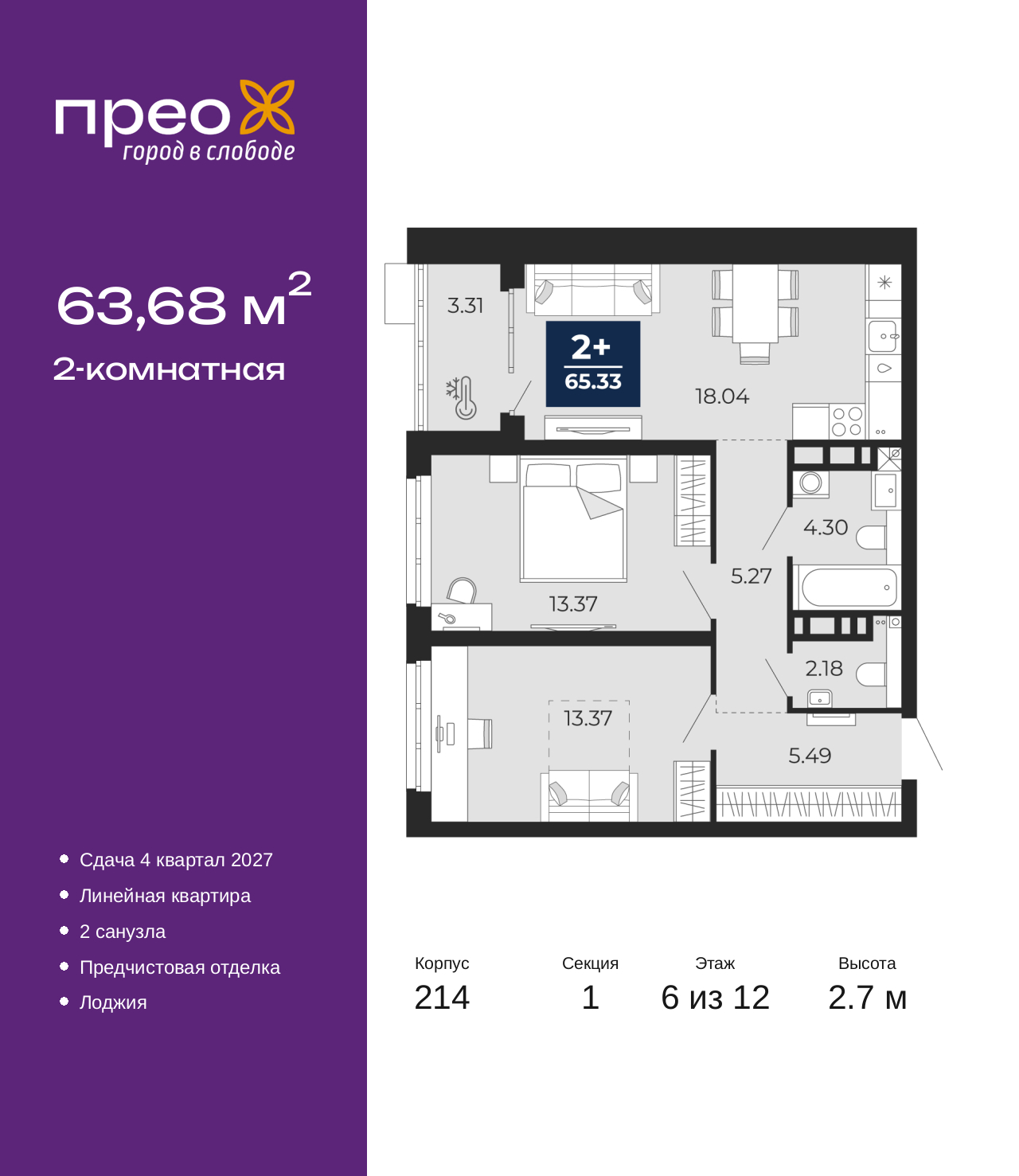 Двухкомнатная квартира от застройщика с предчистовой отделкой в ЖК "Прео" на 6 этаже. Общая площадь: 63.68 кв.м., жилая: 26.74 кв.м., площадь просторной кухни-столовой: 18.04 кв.м. Комнаты изолированные, все окна выходят на одну сторону. В квартире одна лоджия, один совмещенный и один раздельный санузел. Высота потолков 2.7 м. Дом монолитный, двухподъездный, переменной этажности, от 12 до 20 этажей. Квартира находится в 1-й секции высотой 12 этажей в корпусе 214. На этаже 8 квартир. В подъезде 1 пассажирский и 1 грузовой лифт. Окончание строительства - 4 квартал 2027 года. Оформление сделки по договору долевого участия. Преображенский — один из самых привлекательных районов для жизни! Это полностью самостоятельный жилой район с точки зрения инфраструктуры. Преображенский находится между Московским и Червишевским трактами в квартале улиц Закалужская — Вьюжная — Александра Протозанова. Не нужно ждать, когда появится инфраструктура — переезжайте на всё готовое. Вблизи расположены действующие школа и детский сад. В этом году откроется еще один сад, а в следующем году — школа. По соседству с Преображенским запланировано строительство городского парка «Комарово» площадью 38 гектар. За 10 минут можно доехать на автомобиле до крупных ТРЦ: «Лента», «Кристалл», «Леруа Мерлен», «Метро» и «Ашан». С 2018 года в районе открыт Соседский центр — пространство, созданное для формирования добрососедской среды, совместного досуга, общения и реализации соседских инициатив. Здесь проходят встречи соседей, а также сами жители района организовывают мероприятия. Организатором такого события может стать любой желающий. В квартирах выполнена качественная предчистовая отделка. Гладкие стены с финишным выравниванием по маякам. Ровный потолок для установки натяжного потолка. Установлены пятикамерные окна с двойным стеклопакетом (3 стекла). Дизайнерские холлы с видеонаблюдением, безбарьерным и прозрачным входом – всегда светло и спокойно. На первом этаже есть просторные колясочные, где все жители могут оставлять свои коляски и велосипеды. В Преображенском есть всё, что нужно для активного отдыха и занятий спортом. Мы сделали большое футбольное поле с безопасным покрытием. Также установили хоккейный корт, который оборудован по всем необходимым стандартам. Во дворах можно делать упражнения на специальных площадках с турниками. Весь район мы обустроили велодорожками, которые связаны в единый маршрут. У нас есть сухие фонтаны, бьющие из земли, деревья, веревки, сетки, скалодром, газон, песок и резинка — осталось просто дать своему ребенку право на свободную игру. По-настоящему хорошие дворы — это те, которые дети предпочитают соцсетям и телевизору. Аккредитация в банках: ПАО «Банк Уралсиб», ПАО «Газпромбанк», «Сбербанк России», ПАО Банк «ВТБ», ОАО «Альфа-Банк» и других. (AQID02525614)