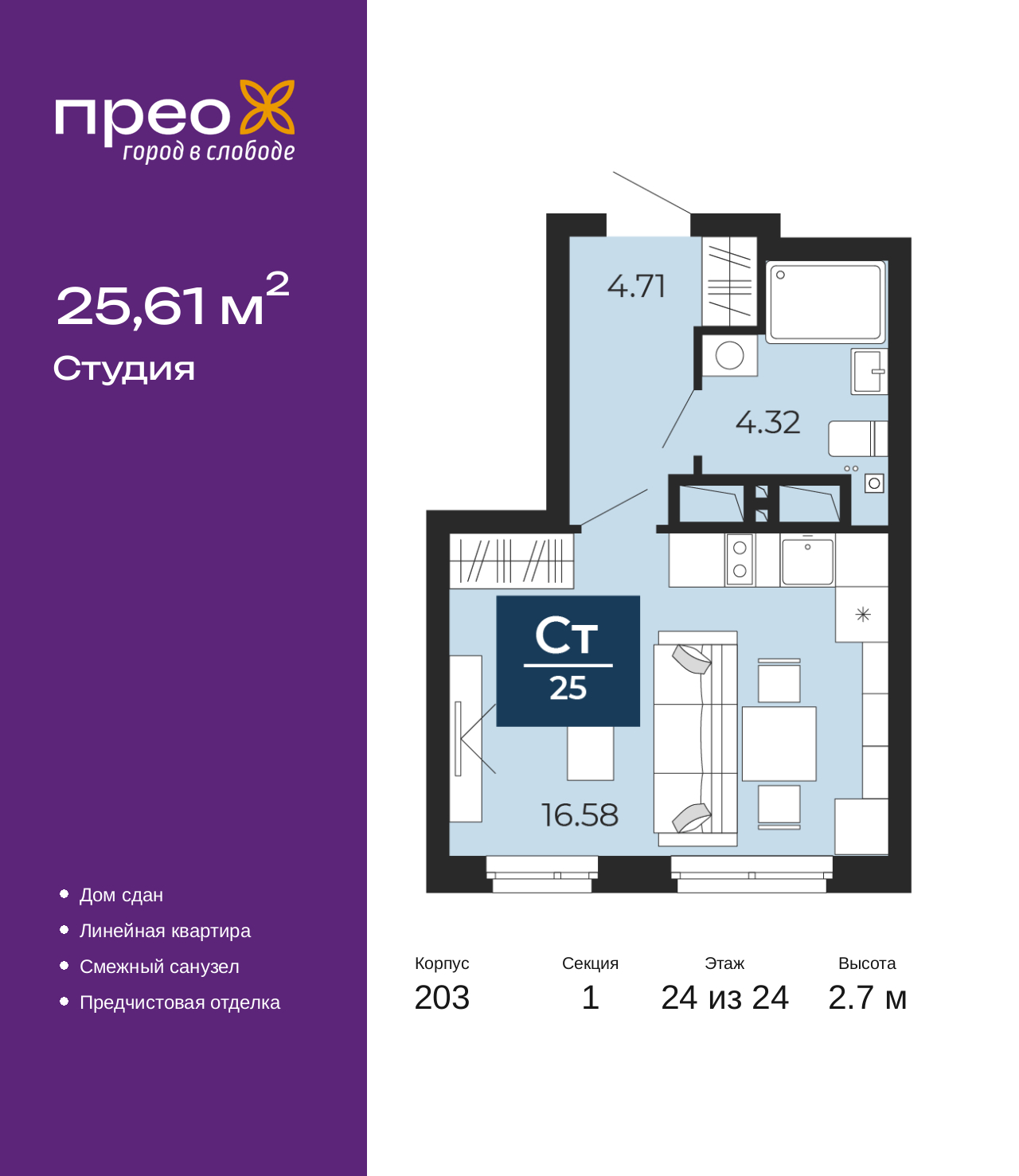 - Общая площадь 25.61 м²