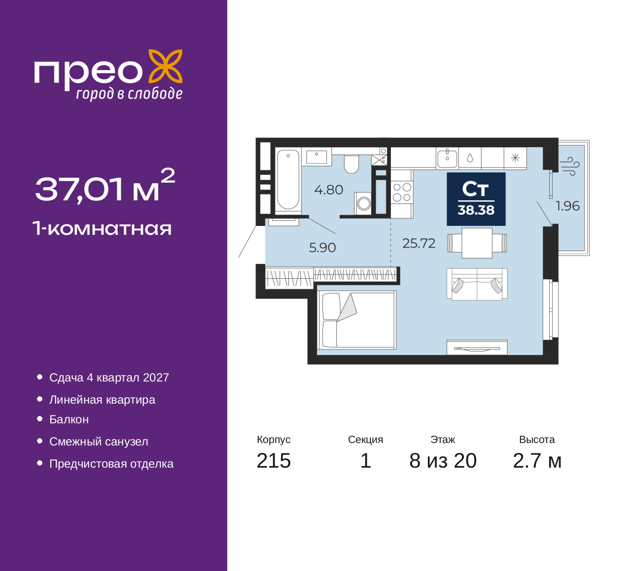 1-комн. квартира с предчистовой отделкой в ЖК "Прео" на 8 этаже. Общая площадь: 37.01 кв.м., жилая: 20.72 кв.м., площадь кухни: 5 кв.м. Все окна выходят на одну сторону. В квартире один балкон, один совмещенный санузел. Высота потолков 2.7 м. Квартира находится в корпусе 215. Дом монолитный, одноподъездный, высотой 20 этажей. На этаже 8 квартир. В подъезде 1 пассажирский и 1 грузовой лифт. Окончание строительства - 4 квартал 2027 года. Оформление сделки по договору долевого участия. Преображенский — один из самых привлекательных районов для жизни! Это полностью самостоятельный жилой район с точки зрения инфраструктуры. Преображенский находится между Московским и Червишевским трактами в квартале улиц Закалужская — Вьюжная — Александра Протозанова. Не нужно ждать, когда появится инфраструктура — переезжайте на всё готовое. Вблизи расположены действующие школа и детский сад. В этом году откроется еще один сад, а в следующем году — школа. По соседству с Преображенским запланировано строительство городского парка «Комарово» площадью 38 гектар. За 10 минут можно доехать на автомобиле до крупных ТРЦ: «Лента», «Кристалл», «Леруа Мерлен», «Метро» и «Ашан». С 2018 года в районе открыт Соседский центр — пространство, созданное для формирования добрососедской среды, совместного досуга, общения и реализации соседских инициатив. Здесь проходят встречи соседей, а также сами жители района организовывают мероприятия. Организатором такого события может стать любой желающий. В квартирах выполнена качественная предчистовая отделка. Гладкие стены с финишным выравниванием по маякам. Ровный потолок для установки натяжного потолка. Установлены пятикамерные окна с двойным стеклопакетом (3 стекла). Дизайнерские холлы с видеонаблюдением, безбарьерным и прозрачным входом – всегда светло и спокойно. На первом этаже есть просторные колясочные, где все жители могут оставлять свои коляски и велосипеды. В Преображенском есть всё, что нужно для активного отдыха и занятий спортом. Мы сделали большое футбольное поле с безопасным покрытием. Также установили хоккейный корт, который оборудован по всем необходимым стандартам. Во дворах можно делать упражнения на специальных площадках с турниками. Весь район мы обустроили велодорожками, которые связаны в единый маршрут. У нас есть сухие фонтаны, бьющие из земли, деревья, веревки, сетки, скалодром, газон, песок и резинка — осталось просто дать своему ребенку право на свободную игру. По-настоящему хорошие дворы — это те, которые дети предпочитают соцсетям и телевизору. Аккредитация в банках: ПАО «Газпромбанк», ПАО «Банк Уралсиб», ПАО Банк «ВТБ», ОАО «Альфа-Банк», «Сбербанк России» и других. (AQID02525475)