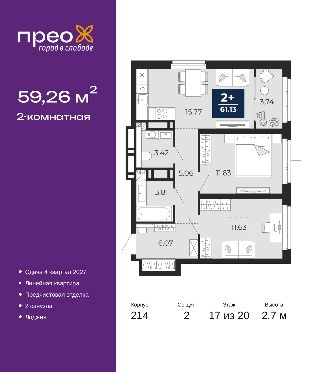 2-комн. квартира от застройщика с предчистовой отделкой в ЖК "Прео" на 17 этаже. Общая площадь: 59.26 кв.м., жилая: 23.26 кв.м., площадь просторной кухни-столовой: 15.77 кв.м. Комнаты изолированные, все окна выходят на одну сторону. В квартире одна лоджия, один совмещенный и один раздельный санузел. Высота потолков 2.7 м. Дом монолитный, двухподъездный, переменной этажности, от 12 до 20 этажей. Квартира находится во 2-й секции высотой 20 этажей в корпусе 214. На этаже 8 квартир. В подъезде 1 пассажирский и 1 грузовой лифт. Окончание строительства - 4 квартал 2027 года. Оформление сделки по договору долевого участия. Преображенский — один из самых привлекательных районов для жизни! Это полностью самостоятельный жилой район с точки зрения инфраструктуры. Преображенский находится между Московским и Червишевским трактами в квартале улиц Закалужская — Вьюжная — Александра Протозанова. Не нужно ждать, когда появится инфраструктура — переезжайте на всё готовое. Вблизи расположены действующие школа и детский сад. В этом году откроется еще один сад, а в следующем году — школа. По соседству с Преображенским запланировано строительство городского парка «Комарово» площадью 38 гектар. За 10 минут можно доехать на автомобиле до крупных ТРЦ: «Лента», «Кристалл», «Леруа Мерлен», «Метро» и «Ашан». С 2018 года в районе открыт Соседский центр — пространство, созданное для формирования добрососедской среды, совместного досуга, общения и реализации соседских инициатив. Здесь проходят встречи соседей, а также сами жители района организовывают мероприятия. Организатором такого события может стать любой желающий. В квартирах выполнена качественная предчистовая отделка. Гладкие стены с финишным выравниванием по маякам. Ровный потолок для установки натяжного потолка. Установлены пятикамерные окна с двойным стеклопакетом (3 стекла). Дизайнерские холлы с видеонаблюдением, безбарьерным и прозрачным входом – всегда светло и спокойно. На первом этаже есть просторные колясочные, где все жители могут оставлять свои коляски и велосипеды. В Преображенском есть всё, что нужно для активного отдыха и занятий спортом. Мы сделали большое футбольное поле с безопасным покрытием. Также установили хоккейный корт, который оборудован по всем необходимым стандартам. Во дворах можно делать упражнения на специальных площадках с турниками. Весь район мы обустроили велодорожками, которые связаны в единый маршрут. У нас есть сухие фонтаны, бьющие из земли, деревья, веревки, сетки, скалодром, газон, песок и резинка — осталось просто дать своему ребенку право на свободную игру. По-настоящему хорошие дворы — это те, которые дети предпочитают соцсетям и телевизору. Аккредитация в банках: ПАО «Банк Уралсиб», ОАО «Альфа-Банк», ПАО «Газпромбанк», ПАО Банк «ВТБ», «Сбербанк России» и других. (AQID02525581)