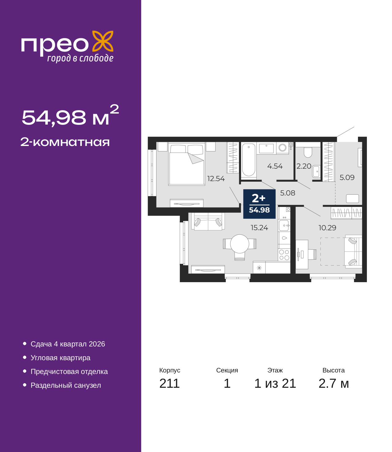 Просторная 2-комн. квартира с предчистовой отделкой в ЖК "Прео" на 1 этаже. Общая площадь: 54.98 кв.м., жилая: 22.83 кв.м., площадь просторной кухни-столовой: 15.24 кв.м. Угловая квартира, очень светлая, естественная вентиляция при открытии окон. В квартире один раздельный санузел. Высота потолков 2.7 м. Дом монолитный, черырехподъездный, переменной этажности, от 14 до 21 этажей. Квартира находится в 1-й секции высотой 21 этаж в корпусе 211. На этаже 8 квартир. В подъезде 1 пассажирский и 1 грузовой лифт. Окончание строительства - 4 квартал 2026 года. Оформление сделки по договору долевого участия. Преображенский — один из самых привлекательных районов для жизни! Это полностью самостоятельный жилой район с точки зрения инфраструктуры. Преображенский находится между Московским и Червишевским трактами в квартале улиц Закалужская — Вьюжная — Александра Протозанова. Не нужно ждать, когда появится инфраструктура — переезжайте на всё готовое. Вблизи расположены действующие школа и детский сад. В этом году откроется еще один сад, а в следующем году — школа. По соседству с Преображенским запланировано строительство городского парка «Комарово» площадью 38 гектар. За 10 минут можно доехать на автомобиле до крупных ТРЦ: «Лента», «Кристалл», «Леруа Мерлен», «Метро» и «Ашан». С 2018 года в районе открыт Соседский центр — пространство, созданное для формирования добрососедской среды, совместного досуга, общения и реализации соседских инициатив. Здесь проходят встречи соседей, а также сами жители района организовывают мероприятия. Организатором такого события может стать любой желающий. В квартирах выполнена качественная предчистовая отделка. Гладкие стены с финишным выравниванием по маякам. Ровный потолок для установки натяжного потолка. Установлены пятикамерные окна с двойным стеклопакетом (3 стекла). Дизайнерские холлы с видеонаблюдением, безбарьерным и прозрачным входом – всегда светло и спокойно. На первом этаже есть просторные колясочные, где все жители могут оставлять свои коляски и велосипеды. В Преображенском есть всё, что нужно для активного отдыха и занятий спортом. Мы сделали большое футбольное поле с безопасным покрытием. Также установили хоккейный корт, который оборудован по всем необходимым стандартам. Во дворах можно делать упражнения на специальных площадках с турниками. Весь район мы обустроили велодорожками, которые связаны в единый маршрут. У нас есть сухие фонтаны, бьющие из земли, деревья, веревки, сетки, скалодром, газон, песок и резинка — осталось просто дать своему ребенку право на свободную игру. По-настоящему хорошие дворы — это те, которые дети предпочитают соцсетям и телевизору. Аккредитация в банках: ПАО Банк «ВТБ», ПАО «Газпромбанк», ПАО «Банк Уралсиб», «Сбербанк России», ОАО «Альфа-Банк» и других. (AQID02470431)