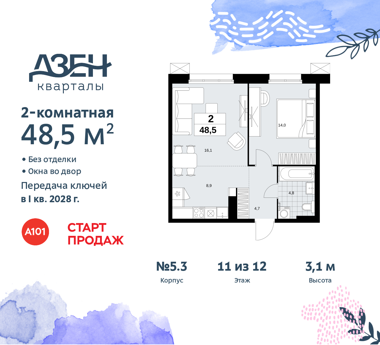 - Общая площадь 48.5 м²