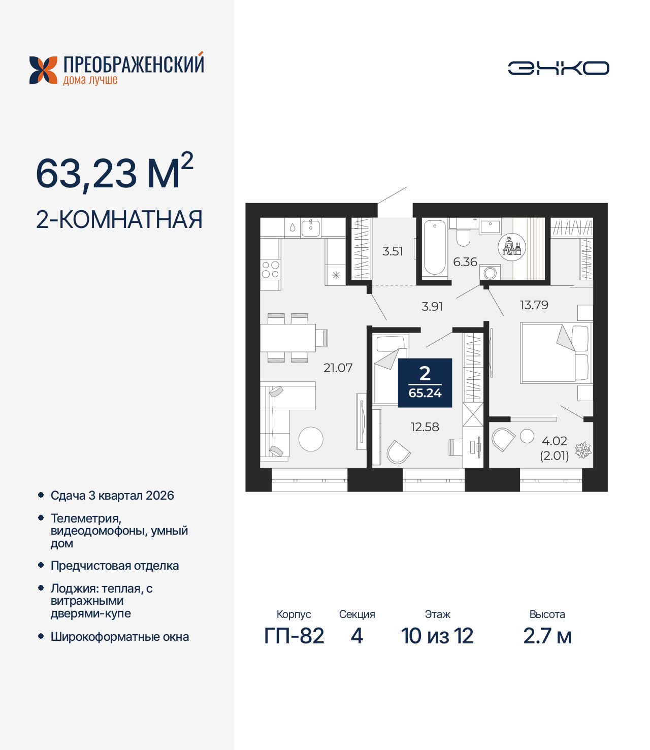 Продается 2-комн. квартира с предчистовой отделкой в ЖК "Преображенский" на 10 этаже. Общая площадь: 63.23 кв.м., жилая: 26.37 кв.м., площадь просторной кухни-столовой: 21.07 кв.м. Комнаты изолированные, все окна выходят на одну сторону. В квартире одна лоджия, один совмещенный санузел. Высота потолков 2.7 м. Дом монолитный, многоподъездный, переменной этажности, от 8 до 12 этажей. Квартира находится в 4-й секции высотой 12 этажей в корпусе ГП-82. На этаже 6 квартир. В подъезде 1 пассажирский и 1 грузовой лифт. Окончание строительства - 3 квартал 2026 года. Оформление сделки по договору долевого участия. Квартал будет расположен в микрорайоне Славянский на пересечении улиц Мира и 70-летия Октября. Престижный район, собственный парк, вся необходимая для жизни, учёбы и работы инфраструктура — новая школа с бассейном и кванториумом, новый детский сад, поликлиника, спорткомплекс, магазины и др. Чтобы в квартирах было как можно больше свободного пространства, мы предусмотрели индивидуальные кладовые на цокольном этаже. Оставляйте коляски и сезонный спортинвентарь после прогулок здесь — удобно для вас и чисто для квартиры. В подземный паркинг можно спуститься на лифте прямо с квартирной площадки. (AQID02484143)
