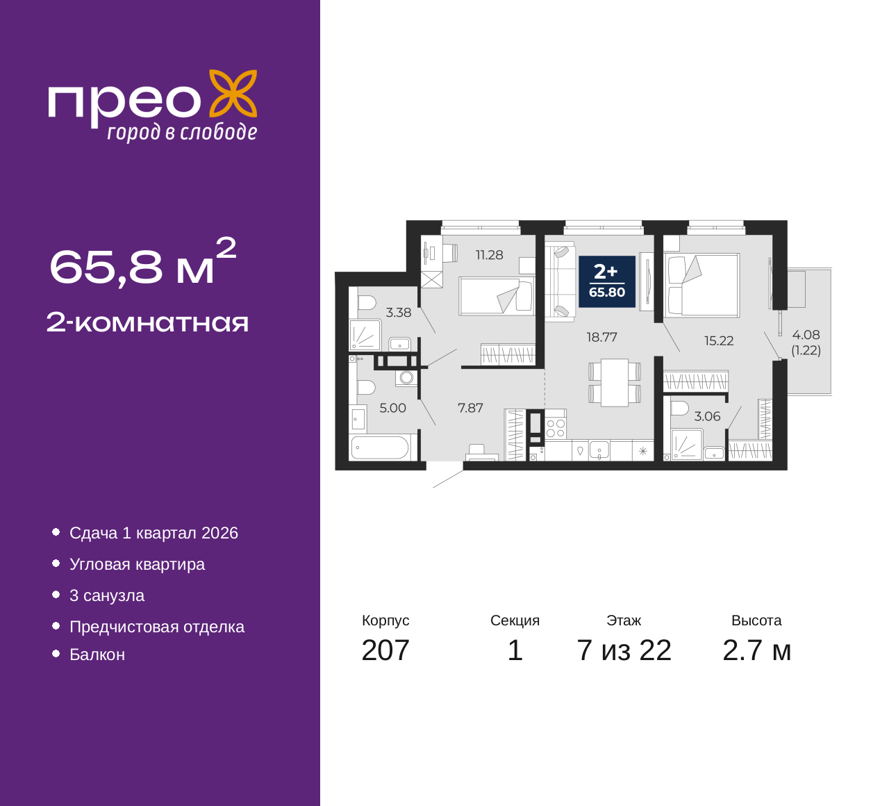 2-комн. квартира с предчистовой отделкой в ЖК "Прео" на 7 этаже. Общая площадь: 65.8 кв.м., жилая: 26.5 кв.м., площадь просторной кухни-столовой: 18.77 кв.м. Квартира угловая, окна oбecпeчивaют paвнoмepнoe ocвeщeниe в тeчeниe дня. В квартире один балкон, три совмещенных санузла. Высота потолков 2.7 м. Дом монолитный, двухподъездный, высотой 22 этажа. Квартира находится в 1-й секции в корпусе 207. На этаже 8 квартир. В подъезде 1 пассажирский и 1 грузовой лифт. Окончание строительства - 1 квартал 2026 года. Оформление сделки по договору долевого участия. Преображенский — один из самых привлекательных районов для жизни! Это полностью самостоятельный жилой район с точки зрения инфраструктуры. Преображенский находится между Московским и Червишевским трактами в квартале улиц Закалужская — Вьюжная — Александра Протозанова. Не нужно ждать, когда появится инфраструктура — переезжайте на всё готовое. Вблизи расположены действующие школа и детский сад. В этом году откроется еще один сад, а в следующем году — школа. По соседству с Преображенским запланировано строительство городского парка «Комарово» площадью 38 гектар. За 10 минут можно доехать на автомобиле до крупных ТРЦ: «Лента», «Кристалл», «Леруа Мерлен», «Метро» и «Ашан». С 2018 года в районе открыт Соседский центр — пространство, созданное для формирования добрососедской среды, совместного досуга, общения и реализации соседских инициатив. Здесь проходят встречи соседей, а также сами жители района организовывают мероприятия. Организатором такого события может стать любой желающий. В квартирах выполнена качественная предчистовая отделка. Гладкие стены с финишным выравниванием по маякам. Ровный потолок для установки натяжного потолка. Установлены пятикамерные окна с двойным стеклопакетом (3 стекла). Дизайнерские холлы с видеонаблюдением, безбарьерным и прозрачным входом – всегда светло и спокойно. На первом этаже есть просторные колясочные, где все жители могут оставлять свои коляски и велосипеды. В Преображенском есть всё, что нужно для активного отдыха и занятий спортом. Мы сделали большое футбольное поле с безопасным покрытием. Также установили хоккейный корт, который оборудован по всем необходимым стандартам. Во дворах можно делать упражнения на специальных площадках с турниками. Весь район мы обустроили велодорожками, которые связаны в единый маршрут. У нас есть сухие фонтаны, бьющие из земли, деревья, веревки, сетки, скалодром, газон, песок и резинка — осталось просто дать своему ребенку право на свободную игру. По-настоящему хорошие дворы — это те, которые дети предпочитают соцсетям и телевизору. Аккредитация в банках: ПАО «Банк Уралсиб», «Сбербанк России», ОАО «Альфа-Банк», ПАО Банк «ВТБ», ПАО «Газпромбанк» и других. (AQID02488217)
