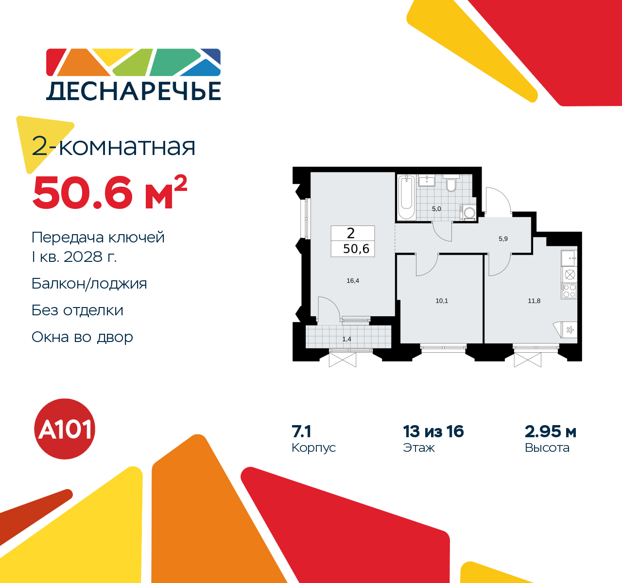 Двухкомнатная квартира от застройщика в ЖК "Деснаречье" на 13 этаже. Квартира без отделки, новый владелец может сделать ремонт по своему дизайн-проекту. Общая площадь: 50.6 кв.м., жилая: 26.5 кв.м., площадь просторной кухни-столовой: 11.8 кв.м. Квартира угловая, очень светлая, естественная вентиляция при открытии окон. В квартире одна лоджия, один совмещенный санузел. Высота потолков 2.95 м. Эта квартира предлагается без отделки. Будут установлены стеклопакеты с повышенной тепло- и шумоизоляцией, в квартиру заведены все коммуникации. Вы сможете в полном объеме реализовать ваши идеи обустройства вашего комфортного дома. Для тех, кто ценит время и не хочет дополнительных трат на ремонт мы предлагаем квартиры с предчистовой и дизайнерской отделкой. Дом монолитный, многоподъездный, переменной этажности, от 8 до 16 этажей. Квартира находится в 1-й секции высотой 14 этажей в корпусе 7.1. На этаже 5 квартир. В подъезде 1 пассажирский и 1 грузовой лифт. Начало строительства - 2 квартал 2025 года. Окончание строительства - 1 квартал 2028 года. Оформление сделки по договору долевого участия. Артикул квартиры по базе застройщика 88К-7.1-56. Масштабный проект "Деснаречье" на юго-западе Москвы, который включает три новых района («квартала»), объединённые общей идеей – воплотить в реальность мечты современных жителей столицы об интересном, комфортном и разноплановом городском пространстве в окружении рек и лесов, словно сошедших с полотен русских живописцев: - «Берег» оценят все, кому близка водная стихия: плеск волн, солнечные блики и прогулки вдоль тихого течения речи. - «Лес» утопает в зелени парков и лесов. Здесь соблюдён идеальный баланс загородного спокойствия и столичного комфорта. - «Парк», самый энергичный и яркий, отличается высокой концентрацией пространств для спорта и творчества. Жилой комплекс "Деснаречье" расположится в 12 км от МКАД по современному Калужскому шоссе. Внешний облик зданий соответствует современному стилю и стандартам, характерным и для других популярных проектов ГК «А101»: сочетание контрастных тонов, большое количество остекления, в котором отражается небо, гармония с природным окружением. Весь город - в вашем районе. Находиться на территории «15-минутного города» значит иметь всё необходимое для полноценной жизни в шаговой доступности. Маршруты в районе «Деснаречье» выстроены так, чтобы добраться до магазинов, парков, школ, салонов услуг и других объектов можно было всего за несколько минут пешком или на велосипеде. Двор закрытый от машин – это тишина, комфорт и безопасность, поэтому все машино-места (включая «семейные» и увеличенные, с возможностью установки роллетных шкафов) находятся в подземном паркинге. В паркинги можно спуститься на лифте из любого подъезда или по лестнице. Рядом с «Деснаречьем» в 2027 году планируется открытие станции метро «Десна», до которой будет удобно добраться пешком или на велосипеде. Дорога на автомобиле до перехватывающих парковок станций «Ольховая» и «Прокшино» займёт около 10 минут. В процессе реализации проекта будут появляться новые маршруты общественного транспорта по районам. Уже сейчас на Калужском шоссе развита сеть наземного транспорта: два десятка автобусов и маршрутных такси прибывают на остановки с интервалом 5–10 минут. (AQID02490366)
