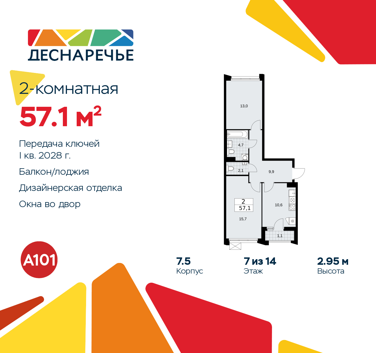 2-комн. квартира с отделкой в ЖК "Деснаречье" на 7 этаже. Общая площадь: 57.1 кв.м., жилая: 28.7 кв.м., площадь просторной кухни-столовой: 10.6 кв.м. Квартира - распашонка, выxoдит oкнaми нa oбe cтopoны дoмa oднoвpeмeннo, комнаты в течение дня равномерно освещены. В квартире одна лоджия, один совмещенный и один раздельный санузел. Высота потолков 2.95 м. Эта квартира будет сдана с дизайнеркой отделкой "под ключ". Специально для вас мы разработали несколько решений дизайнерской отделки. В отделке используются только современный высококлассные материалы, на все работы предоставляется гарантия. В таком случае вы оплачиваете отделку в сегодняшних ценах, а эту стоимость вы можете разнести в ипотечных платежах. Дом монолитный, трехподъездный, переменной этажности, от 11 до 17 этажей. Квартира находится во 2-й секции высотой 17 этажей в корпусе 7.5. На этаже 4 квартиры. В подъезде 1 пассажирский и 1 грузовой лифт. Начало строительства - 2 квартал 2025 года. Окончание строительства - 1 квартал 2028 года. Оформление сделки по договору долевого участия. Артикул квартиры по базе застройщика 88К-7.5-1129. Масштабный проект "Деснаречье" на юго-западе Москвы, который включает три новых района («квартала»), объединённые общей идеей – воплотить в реальность мечты современных жителей столицы об интересном, комфортном и разноплановом городском пространстве в окружении рек и лесов, словно сошедших с полотен русских живописцев: - «Берег» оценят все, кому близка водная стихия: плеск волн, солнечные блики и прогулки вдоль тихого течения речи. - «Лес» утопает в зелени парков и лесов. Здесь соблюдён идеальный баланс загородного спокойствия и столичного комфорта. - «Парк», самый энергичный и яркий, отличается высокой концентрацией пространств для спорта и творчества. Жилой комплекс "Деснаречье" расположится в 12 км от МКАД по современному Калужскому шоссе. Внешний облик зданий соответствует современному стилю и стандартам, характерным и для других популярных проектов ГК «А101»: сочетание контрастных тонов, большое количество остекления, в котором отражается небо, гармония с природным окружением. Весь город - в вашем районе. Находиться на территории «15-минутного города» значит иметь всё необходимое для полноценной жизни в шаговой доступности. Маршруты в районе «Деснаречье» выстроены так, чтобы добраться до магазинов, парков, школ, салонов услуг и других объектов можно было всего за несколько минут пешком или на велосипеде. Двор закрытый от машин – это тишина, комфорт и безопасность, поэтому все машино-места (включая «семейные» и увеличенные, с возможностью установки роллетных шкафов) находятся в подземном паркинге. В паркинги можно спуститься на лифте из любого подъезда или по лестнице. Рядом с «Деснаречьем» в 2027 году планируется открытие станции метро «Десна», до которой будет удобно добраться пешком или на велосипеде. Дорога на автомобиле до перехватывающих парковок станций «Ольховая» и «Прокшино» займёт около 10 минут. В процессе реализации проекта будут появляться новые маршруты общественного транспорта по районам. Уже сейчас на Калужском шоссе развита сеть наземного транспорта: два десятка автобусов и маршрутных такси прибывают на остановки с интервалом 5–10 минут. (AQID02491416)