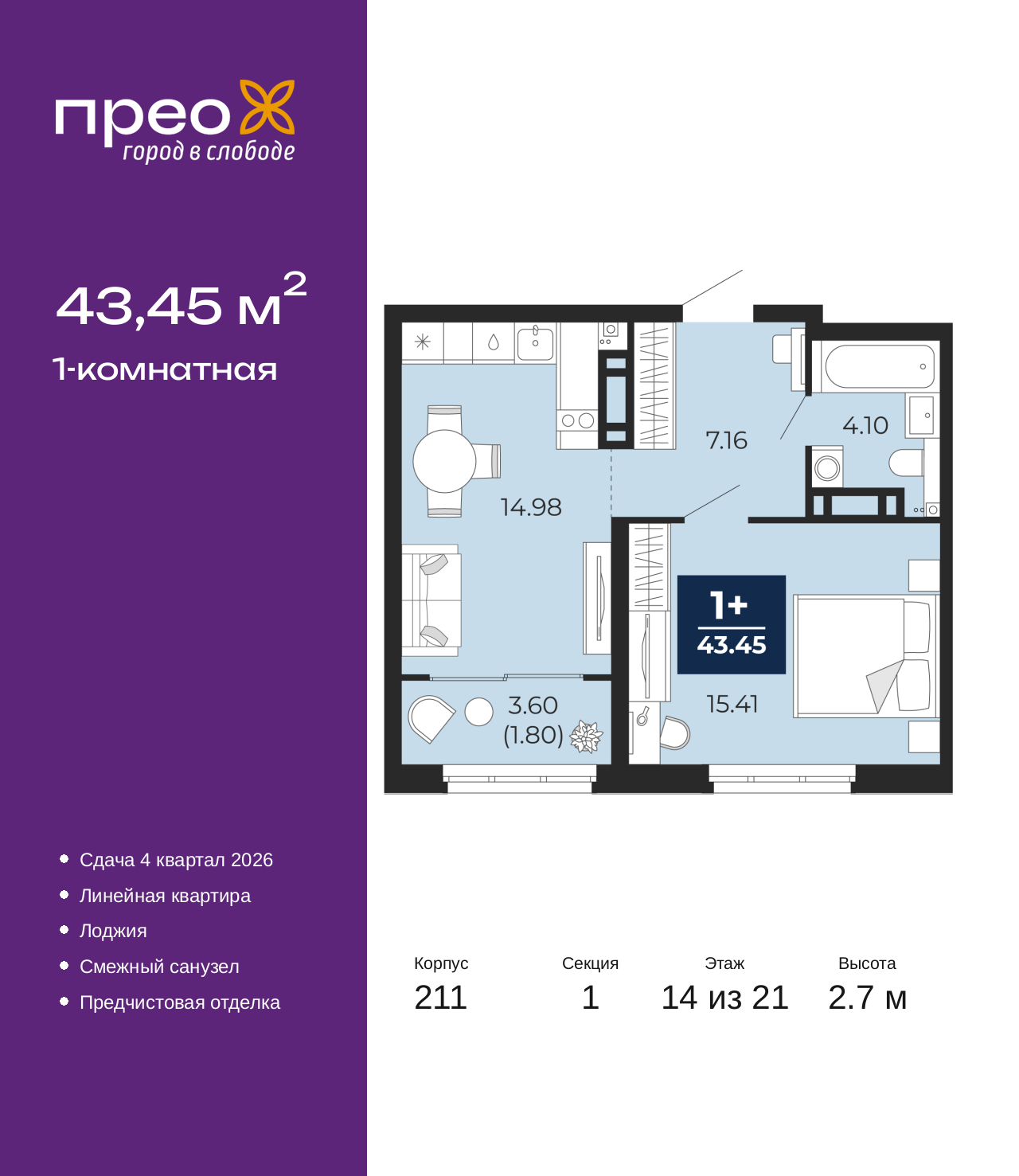 Продается 1-комн. квартира с предчистовой отделкой в ЖК "Прео" на 14 этаже. Общая площадь: 43.45 кв.м., жилая: 15.41 кв.м., площадь просторной кухни-столовой: 14.98 кв.м. Все окна выходят на одну сторону. В квартире одна лоджия, один совмещенный санузел. Высота потолков 2.7 м. Дом монолитный, черырехподъездный, переменной этажности, от 14 до 21 этажей. Квартира находится в 1-й секции высотой 21 этаж в корпусе 211. На этаже 8 квартир. В подъезде 1 пассажирский и 1 грузовой лифт. Окончание строительства - 4 квартал 2026 года. Оформление сделки по договору долевого участия. Преображенский — один из самых привлекательных районов для жизни! Это полностью самостоятельный жилой район с точки зрения инфраструктуры. Преображенский находится между Московским и Червишевским трактами в квартале улиц Закалужская — Вьюжная — Александра Протозанова. Не нужно ждать, когда появится инфраструктура — переезжайте на всё готовое. Вблизи расположены действующие школа и детский сад. В этом году откроется еще один сад, а в следующем году — школа. По соседству с Преображенским запланировано строительство городского парка «Комарово» площадью 38 гектар. За 10 минут можно доехать на автомобиле до крупных ТРЦ: «Лента», «Кристалл», «Леруа Мерлен», «Метро» и «Ашан». С 2018 года в районе открыт Соседский центр — пространство, созданное для формирования добрососедской среды, совместного досуга, общения и реализации соседских инициатив. Здесь проходят встречи соседей, а также сами жители района организовывают мероприятия. Организатором такого события может стать любой желающий. В квартирах выполнена качественная предчистовая отделка. Гладкие стены с финишным выравниванием по маякам. Ровный потолок для установки натяжного потолка. Установлены пятикамерные окна с двойным стеклопакетом (3 стекла). Дизайнерские холлы с видеонаблюдением, безбарьерным и прозрачным входом – всегда светло и спокойно. На первом этаже есть просторные колясочные, где все жители могут оставлять свои коляски и велосипеды. В Преображенском есть всё, что нужно для активного отдыха и занятий спортом. Мы сделали большое футбольное поле с безопасным покрытием. Также установили хоккейный корт, который оборудован по всем необходимым стандартам. Во дворах можно делать упражнения на специальных площадках с турниками. Весь район мы обустроили велодорожками, которые связаны в единый маршрут. У нас есть сухие фонтаны, бьющие из земли, деревья, веревки, сетки, скалодром, газон, песок и резинка — осталось просто дать своему ребенку право на свободную игру. По-настоящему хорошие дворы — это те, которые дети предпочитают соцсетям и телевизору. Аккредитация в банках: ОАО «Альфа-Банк», «Сбербанк России», ПАО «Газпромбанк», ПАО «Банк Уралсиб», ПАО Банк «ВТБ» и других. (AQID02427579)