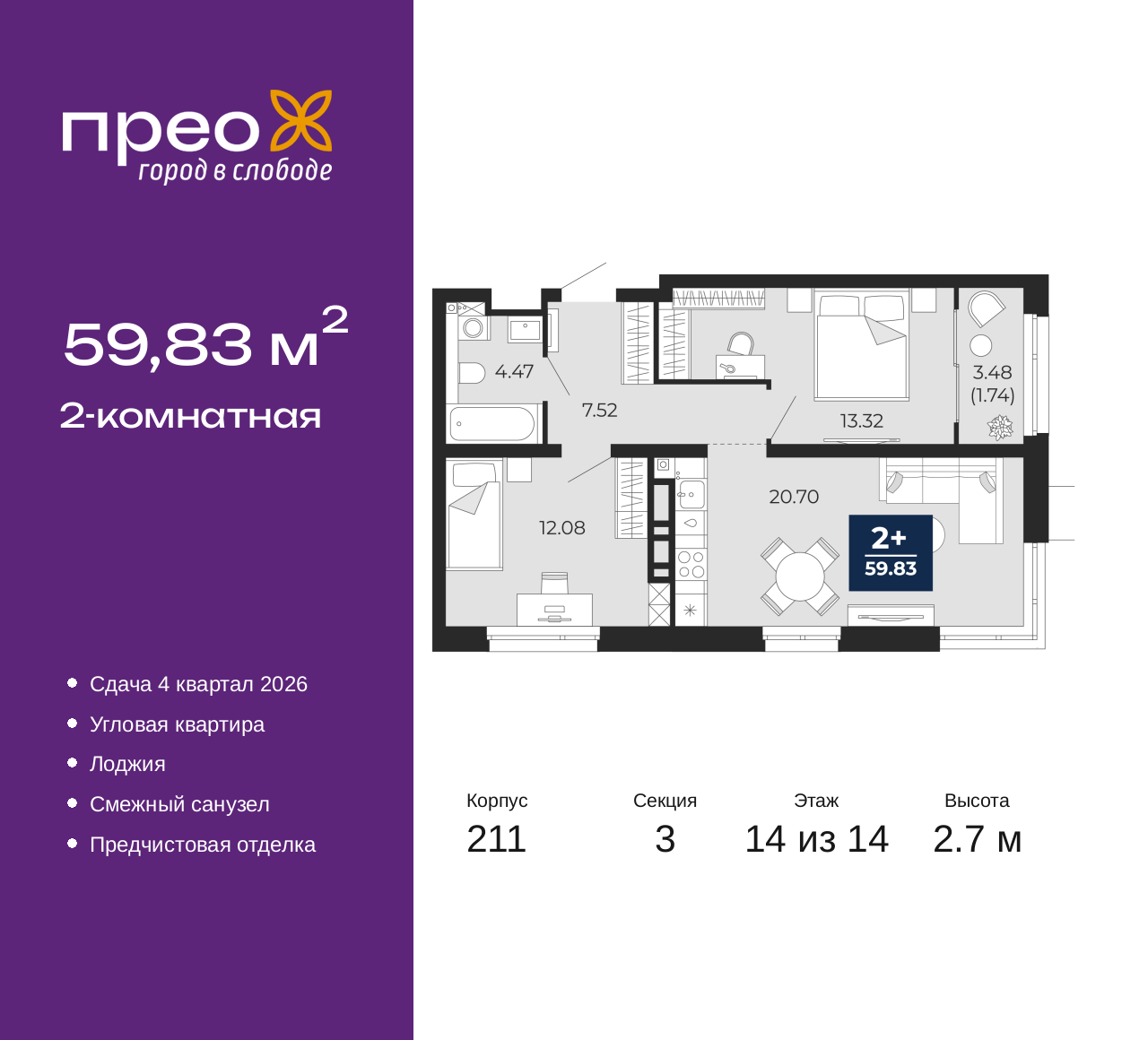 2-комн. квартира с предчистовой отделкой в ЖК "Прео" на 14 этаже. Общая площадь: 59.83 кв.м., жилая: 25.4 кв.м., площадь просторной кухни-столовой: 20.7 кв.м. Квартира угловая, идеально подойдет любителям тишины и панорамных видов. В квартире одна лоджия, один совмещенный санузел. Высота потолков 2.7 м. Дом монолитный, черырехподъездный, переменной этажности, от 14 до 21 этажей. Квартира находится в 3-й секции высотой 14 этажей в корпусе 211. На этаже 6 квартир. В подъезде 1 пассажирский и 1 грузовой лифт. Окончание строительства - 4 квартал 2026 года. Оформление сделки по договору долевого участия. Преображенский — один из самых привлекательных районов для жизни! Это полностью самостоятельный жилой район с точки зрения инфраструктуры. Преображенский находится между Московским и Червишевским трактами в квартале улиц Закалужская — Вьюжная — Александра Протозанова. Не нужно ждать, когда появится инфраструктура — переезжайте на всё готовое. Вблизи расположены действующие школа и детский сад. В этом году откроется еще один сад, а в следующем году — школа. По соседству с Преображенским запланировано строительство городского парка «Комарово» площадью 38 гектар. За 10 минут можно доехать на автомобиле до крупных ТРЦ: «Лента», «Кристалл», «Леруа Мерлен», «Метро» и «Ашан». С 2018 года в районе открыт Соседский центр — пространство, созданное для формирования добрососедской среды, совместного досуга, общения и реализации соседских инициатив. Здесь проходят встречи соседей, а также сами жители района организовывают мероприятия. Организатором такого события может стать любой желающий. В квартирах выполнена качественная предчистовая отделка. Гладкие стены с финишным выравниванием по маякам. Ровный потолок для установки натяжного потолка. Установлены пятикамерные окна с двойным стеклопакетом (3 стекла). Дизайнерские холлы с видеонаблюдением, безбарьерным и прозрачным входом – всегда светло и спокойно. На первом этаже есть просторные колясочные, где все жители могут оставлять свои коляски и велосипеды. В Преображенском есть всё, что нужно для активного отдыха и занятий спортом. Мы сделали большое футбольное поле с безопасным покрытием. Также установили хоккейный корт, который оборудован по всем необходимым стандартам. Во дворах можно делать упражнения на специальных площадках с турниками. Весь район мы обустроили велодорожками, которые связаны в единый маршрут. У нас есть сухие фонтаны, бьющие из земли, деревья, веревки, сетки, скалодром, газон, песок и резинка — осталось просто дать своему ребенку право на свободную игру. По-настоящему хорошие дворы — это те, которые дети предпочитают соцсетям и телевизору. Аккредитация в банках: ПАО «Банк Уралсиб», ПАО «Газпромбанк», ОАО «Альфа-Банк», «Сбербанк России», ПАО Банк «ВТБ» и других. (AQID02499392)