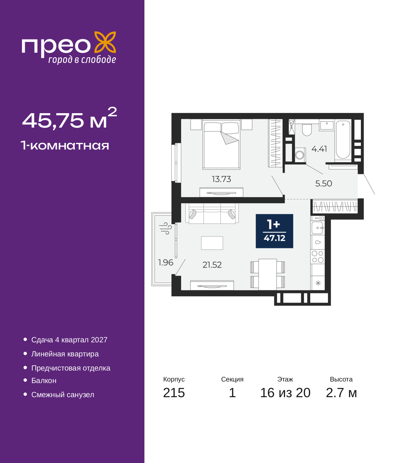 1-комн. квартира с предчистовой отделкой в ЖК "Прео" на 16 этаже. Общая площадь: 45.75 кв.м., жилая: 13.73 кв.м., площадь просторной кухни-столовой: 21.52 кв.м. Все окна выходят на одну сторону. В квартире один балкон, один совмещенный санузел. Высота потолков 2.7 м. Квартира находится в корпусе 215. Дом монолитный, одноподъездный, высотой 20 этажей. На этаже 8 квартир. В подъезде 1 пассажирский и 1 грузовой лифт. Окончание строительства - 4 квартал 2027 года. Оформление сделки по договору долевого участия. Преображенский — один из самых привлекательных районов для жизни! Это полностью самостоятельный жилой район с точки зрения инфраструктуры. Преображенский находится между Московским и Червишевским трактами в квартале улиц Закалужская — Вьюжная — Александра Протозанова. Не нужно ждать, когда появится инфраструктура — переезжайте на всё готовое. Вблизи расположены действующие школа и детский сад. В этом году откроется еще один сад, а в следующем году — школа. По соседству с Преображенским запланировано строительство городского парка «Комарово» площадью 38 гектар. За 10 минут можно доехать на автомобиле до крупных ТРЦ: «Лента», «Кристалл», «Леруа Мерлен», «Метро» и «Ашан». С 2018 года в районе открыт Соседский центр — пространство, созданное для формирования добрососедской среды, совместного досуга, общения и реализации соседских инициатив. Здесь проходят встречи соседей, а также сами жители района организовывают мероприятия. Организатором такого события может стать любой желающий. В квартирах выполнена качественная предчистовая отделка. Гладкие стены с финишным выравниванием по маякам. Ровный потолок для установки натяжного потолка. Установлены пятикамерные окна с двойным стеклопакетом (3 стекла). Дизайнерские холлы с видеонаблюдением, безбарьерным и прозрачным входом – всегда светло и спокойно. На первом этаже есть просторные колясочные, где все жители могут оставлять свои коляски и велосипеды. В Преображенском есть всё, что нужно для активного отдыха и занятий спортом. Мы сделали большое футбольное поле с безопасным покрытием. Также установили хоккейный корт, который оборудован по всем необходимым стандартам. Во дворах можно делать упражнения на специальных площадках с турниками. Весь район мы обустроили велодорожками, которые связаны в единый маршрут. У нас есть сухие фонтаны, бьющие из земли, деревья, веревки, сетки, скалодром, газон, песок и резинка — осталось просто дать своему ребенку право на свободную игру. По-настоящему хорошие дворы — это те, которые дети предпочитают соцсетям и телевизору. Аккредитация в банках: ПАО «Газпромбанк», ОАО «Альфа-Банк», «Сбербанк России», ПАО «Банк Уралсиб», ПАО Банк «ВТБ» и других. (AQID02525509)