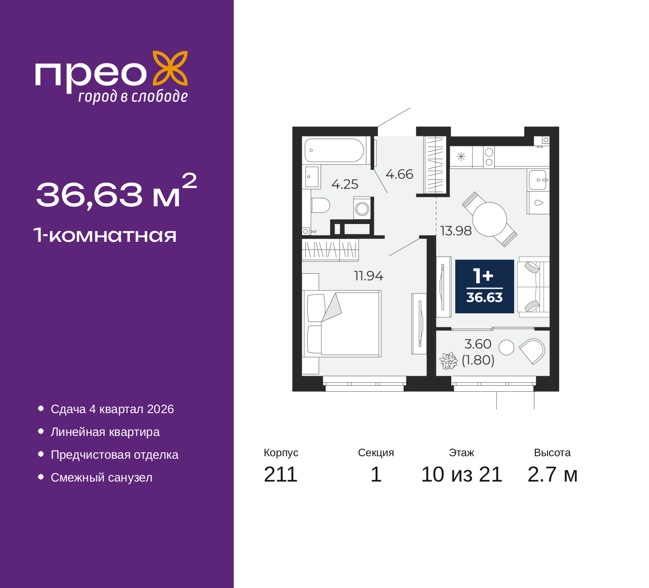 Продается однокомнатная квартира от застройщика с предчистовой отделкой в ЖК "Прео" на 10 этаже. Общая площадь: 36.63 кв.м., жилая: 11.94 кв.м., площадь просторной кухни-столовой: 13.98 кв.м. Все окна выходят на одну сторону. В квартире один совмещенный санузел. Высота потолков 2.7 м. Дом монолитный, черырехподъездный, переменной этажности, от 14 до 21 этажей. Квартира находится в 1-й секции высотой 21 этаж в корпусе 211. На этаже 8 квартир. В подъезде 1 пассажирский и 1 грузовой лифт. Окончание строительства - 4 квартал 2026 года. Оформление сделки по договору долевого участия. Преображенский — один из самых привлекательных районов для жизни! Это полностью самостоятельный жилой район с точки зрения инфраструктуры. Преображенский находится между Московским и Червишевским трактами в квартале улиц Закалужская — Вьюжная — Александра Протозанова. Не нужно ждать, когда появится инфраструктура — переезжайте на всё готовое. Вблизи расположены действующие школа и детский сад. В этом году откроется еще один сад, а в следующем году — школа. По соседству с Преображенским запланировано строительство городского парка «Комарово» площадью 38 гектар. За 10 минут можно доехать на автомобиле до крупных ТРЦ: «Лента», «Кристалл», «Леруа Мерлен», «Метро» и «Ашан». С 2018 года в районе открыт Соседский центр — пространство, созданное для формирования добрососедской среды, совместного досуга, общения и реализации соседских инициатив. Здесь проходят встречи соседей, а также сами жители района организовывают мероприятия. Организатором такого события может стать любой желающий. В квартирах выполнена качественная предчистовая отделка. Гладкие стены с финишным выравниванием по маякам. Ровный потолок для установки натяжного потолка. Установлены пятикамерные окна с двойным стеклопакетом (3 стекла). Дизайнерские холлы с видеонаблюдением, безбарьерным и прозрачным входом – всегда светло и спокойно. На первом этаже есть просторные колясочные, где все жители могут оставлять свои коляски и велосипеды. В Преображенском есть всё, что нужно для активного отдыха и занятий спортом. Мы сделали большое футбольное поле с безопасным покрытием. Также установили хоккейный корт, который оборудован по всем необходимым стандартам. Во дворах можно делать упражнения на специальных площадках с турниками. Весь район мы обустроили велодорожками, которые связаны в единый маршрут. У нас есть сухие фонтаны, бьющие из земли, деревья, веревки, сетки, скалодром, газон, песок и резинка — осталось просто дать своему ребенку право на свободную игру. По-настоящему хорошие дворы — это те, которые дети предпочитают соцсетям и телевизору. Аккредитация в банках: ПАО «Банк Уралсиб», «Сбербанк России», ПАО Банк «ВТБ», ПАО «Газпромбанк», ОАО «Альфа-Банк» и других. (AQID02427545)