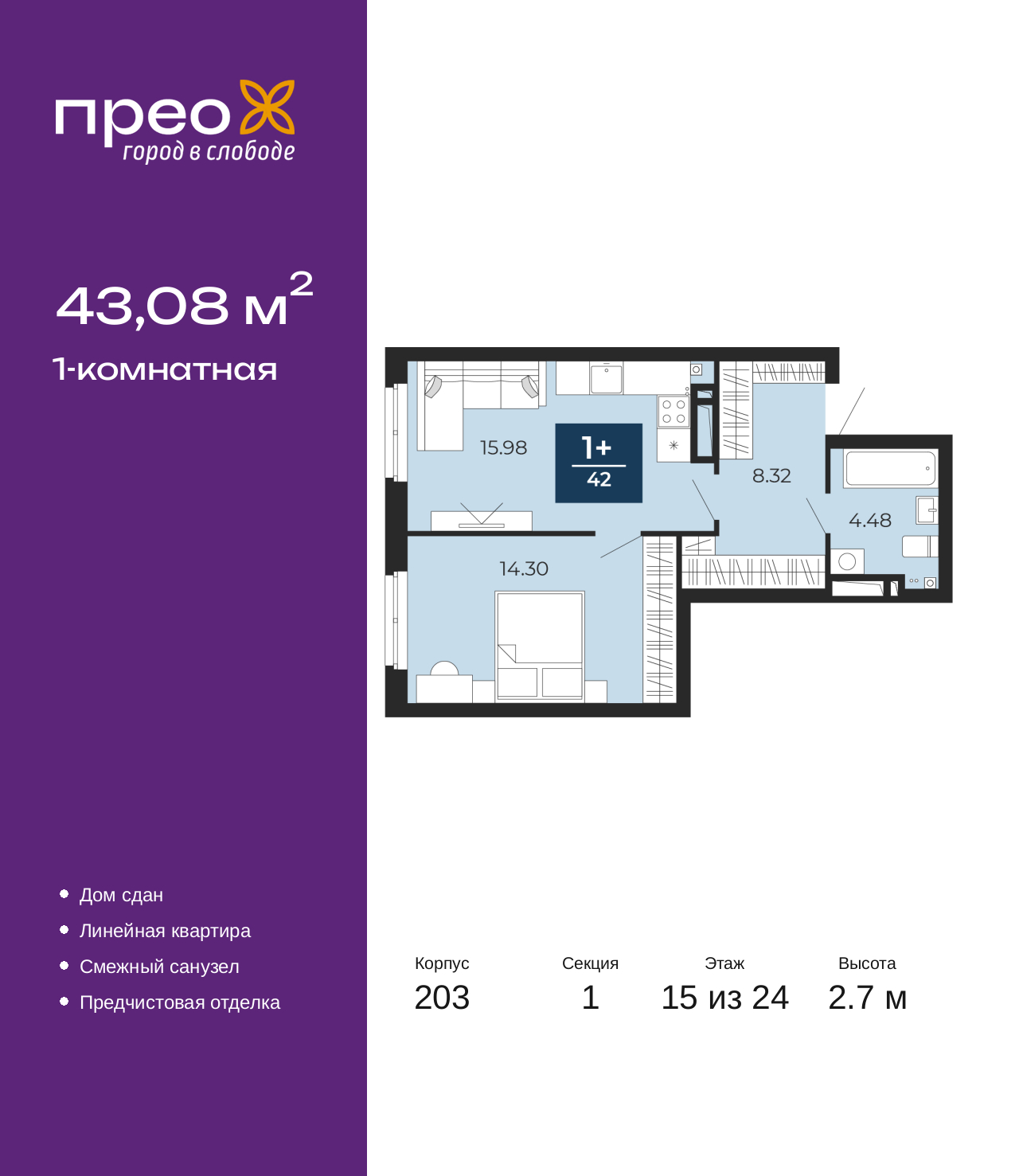 Просторная 1-комн. квартира с предчистовой отделкой в ЖК "Прео" на 15 этаже. Общая площадь: 43.08 кв.м., жилая: 14 кв.м., площадь просторной кухни-столовой: 15.98 кв.м. Все окна выходят на одну сторону. В квартире один совмещенный санузел. Высота потолков 2.7 м. Квартира находится в корпусе 203. Дом монолитный, одноподъездный, высотой 24 этажа. На этаже 14 квартир. В подъезде 2 грузовых лифта. На сегодняшний день строительство завершено, дом сдан в 4 квартале 2024 года. Оформление сделки по договору купли-продажи. Преображенский — один из самых привлекательных районов для жизни! Это полностью самостоятельный жилой район с точки зрения инфраструктуры. Преображенский находится между Московским и Червишевским трактами в квартале улиц Закалужская — Вьюжная — Александра Протозанова. Не нужно ждать, когда появится инфраструктура — переезжайте на всё готовое. Вблизи расположены действующие школа и детский сад. В этом году откроется еще один сад, а в следующем году — школа. По соседству с Преображенским запланировано строительство городского парка «Комарово» площадью 38 гектар. За 10 минут можно доехать на автомобиле до крупных ТРЦ: «Лента», «Кристалл», «Леруа Мерлен», «Метро» и «Ашан». С 2018 года в районе открыт Соседский центр — пространство, созданное для формирования добрососедской среды, совместного досуга, общения и реализации соседских инициатив. Здесь проходят встречи соседей, а также сами жители района организовывают мероприятия. Организатором такого события может стать любой желающий. В квартирах выполнена качественная предчистовая отделка. Гладкие стены с финишным выравниванием по маякам. Ровный потолок для установки натяжного потолка. Установлены пятикамерные окна с двойным стеклопакетом (3 стекла). Дизайнерские холлы с видеонаблюдением, безбарьерным и прозрачным входом – всегда светло и спокойно. На первом этаже есть просторные колясочные, где все жители могут оставлять свои коляски и велосипеды. В Преображенском есть всё, что нужно для активного отдыха и занятий спортом. Мы сделали большое футбольное поле с безопасным покрытием. Также установили хоккейный корт, который оборудован по всем необходимым стандартам. Во дворах можно делать упражнения на специальных площадках с турниками. Весь район мы обустроили велодорожками, которые связаны в единый маршрут. У нас есть сухие фонтаны, бьющие из земли, деревья, веревки, сетки, скалодром, газон, песок и резинка — осталось просто дать своему ребенку право на свободную игру. По-настоящему хорошие дворы — это те, которые дети предпочитают соцсетям и телевизору. Аккредитация в банках: ПАО Банк «ВТБ», ПАО «Газпромбанк», ПАО «Банк Уралсиб», «Сбербанк России», ОАО «Альфа-Банк» и других. (AQID02483811)