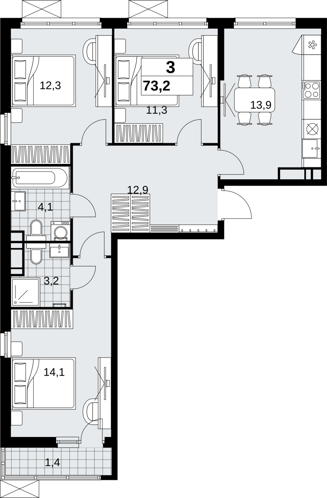 3-комн. квартира от застройщика в ЖК "Скандинавия" на 12 этаже. Квартира без отделки, полностью готова к чистовой отделке и дальнейшему ремонту. Общая площадь: 73.2 кв.м., жилая: 37.7 кв.м., площадь просторной кухни-столовой: 13.9 кв.м. Квартира без проходных комнат, окна выходят нa три cтopoны дома. В квартире один балкон, два совмещенных санузла. Высота потолков 2.95 м. Квартира будет сдана без отделки. Установлены стеклопакеты с повышенной тепло- и шумоизоляцией, установлены элементы отопления, входная дверь, заведены все коммуникации. Дом монолитный, двухподъездный, переменной этажности, от 9 до 15 этажей. Квартира находится во 2-й секции высотой 15 этажей в корпусе 2.18.2.4. На этаже 5 квартир. В подъезде 1 пассажирский и 1 грузовой лифт. Начало строительства - 1 квартал 2024 года. Окончание строительства - 4 квартал 2026 года. Оформление сделки по договору долевого участия. Артикул квартиры по базе застройщика 23К-18.2.4-536. В шаговой доступности от жилого комплекса имеется станция метро (расстояние по прямой) «Потапово» (1.1 км). ЖК "Скандинавия" - один из проектов компании А101, известной своей надежностью. Жилой комплекс расположен на юго-западе Москвы в 6-ти километрах от МКАД в окружении Бутовского лесопарка, район Коммунарка. Рядом открылись новые станции метро. Часть корпусов микрорайона "Скандинавия" уже заселены, полностью сформирована вся инфраструктура: больницы, детские сады, школы, магазины. Отличительная особенность жилого комплекса - невысокие дома, просторные дворы без машин, комфортная благоустроенная придомовая территория. (AQID02532398)