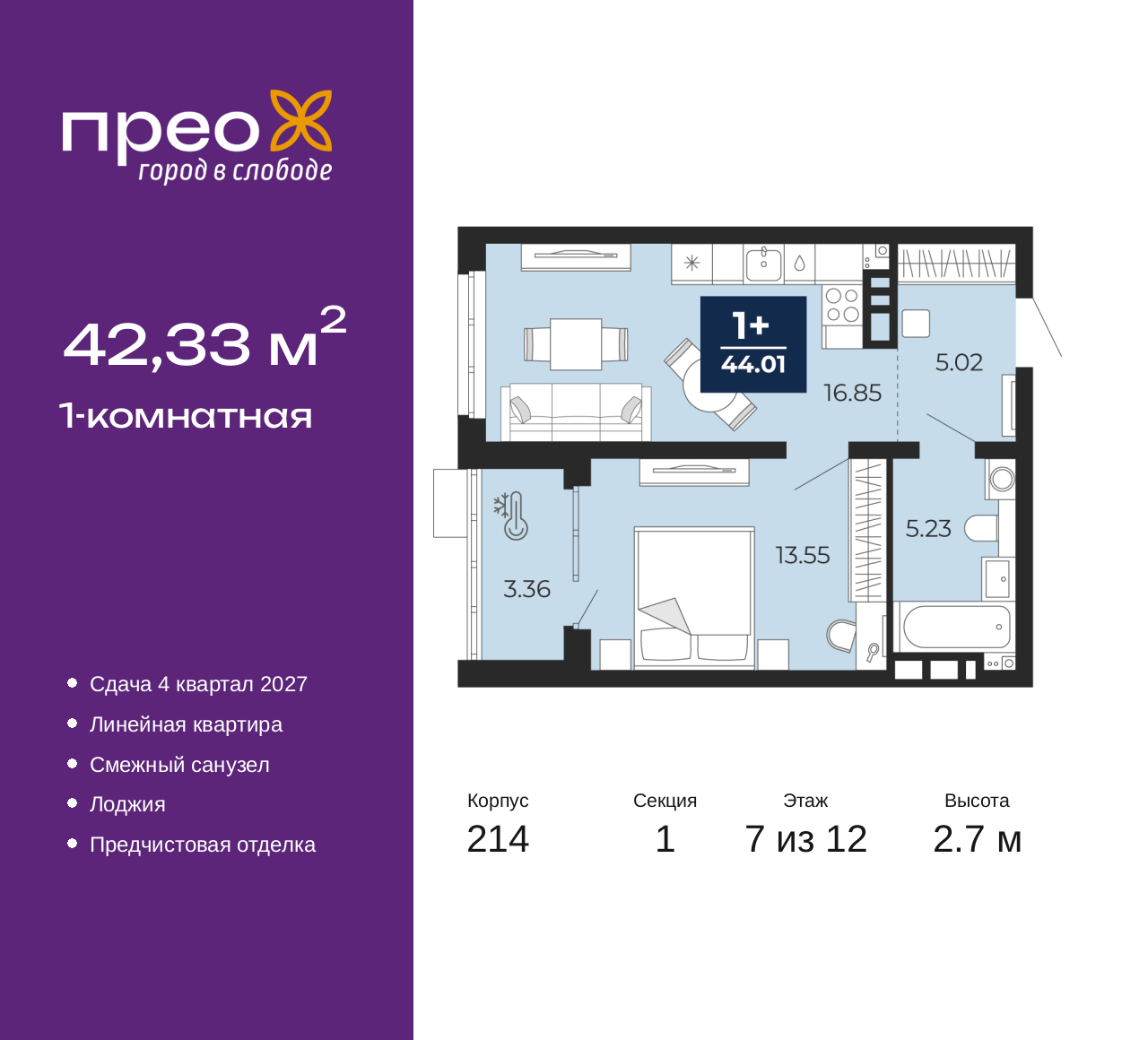 Просторная однокомнатная квартира с предчистовой отделкой в ЖК "Прео" на 7 этаже. Общая площадь: 42.33 кв.м., жилая: 13.55 кв.м., площадь просторной кухни-столовой: 16.85 кв.м. Все окна выходят на одну сторону. В квартире одна лоджия, один совмещенный санузел. Высота потолков 2.7 м. Дом монолитный, двухподъездный, переменной этажности, от 12 до 20 этажей. Квартира находится в 1-й секции высотой 12 этажей в корпусе 214. На этаже 8 квартир. В подъезде 1 пассажирский и 1 грузовой лифт. Окончание строительства - 4 квартал 2027 года. Оформление сделки по договору долевого участия. Преображенский — один из самых привлекательных районов для жизни! Это полностью самостоятельный жилой район с точки зрения инфраструктуры. Преображенский находится между Московским и Червишевским трактами в квартале улиц Закалужская — Вьюжная — Александра Протозанова. Не нужно ждать, когда появится инфраструктура — переезжайте на всё готовое. Вблизи расположены действующие школа и детский сад. В этом году откроется еще один сад, а в следующем году — школа. По соседству с Преображенским запланировано строительство городского парка «Комарово» площадью 38 гектар. За 10 минут можно доехать на автомобиле до крупных ТРЦ: «Лента», «Кристалл», «Леруа Мерлен», «Метро» и «Ашан». С 2018 года в районе открыт Соседский центр — пространство, созданное для формирования добрососедской среды, совместного досуга, общения и реализации соседских инициатив. Здесь проходят встречи соседей, а также сами жители района организовывают мероприятия. Организатором такого события может стать любой желающий. В квартирах выполнена качественная предчистовая отделка. Гладкие стены с финишным выравниванием по маякам. Ровный потолок для установки натяжного потолка. Установлены пятикамерные окна с двойным стеклопакетом (3 стекла). Дизайнерские холлы с видеонаблюдением, безбарьерным и прозрачным входом – всегда светло и спокойно. На первом этаже есть просторные колясочные, где все жители могут оставлять свои коляски и велосипеды. В Преображенском есть всё, что нужно для активного отдыха и занятий спортом. Мы сделали большое футбольное поле с безопасным покрытием. Также установили хоккейный корт, который оборудован по всем необходимым стандартам. Во дворах можно делать упражнения на специальных площадках с турниками. Весь район мы обустроили велодорожками, которые связаны в единый маршрут. У нас есть сухие фонтаны, бьющие из земли, деревья, веревки, сетки, скалодром, газон, песок и резинка — осталось просто дать своему ребенку право на свободную игру. По-настоящему хорошие дворы — это те, которые дети предпочитают соцсетям и телевизору. Аккредитация в банках: ПАО Банк «ВТБ», ОАО «Альфа-Банк», «Сбербанк России», ПАО «Банк Уралсиб», ПАО «Газпромбанк» и других. (AQID02532811)