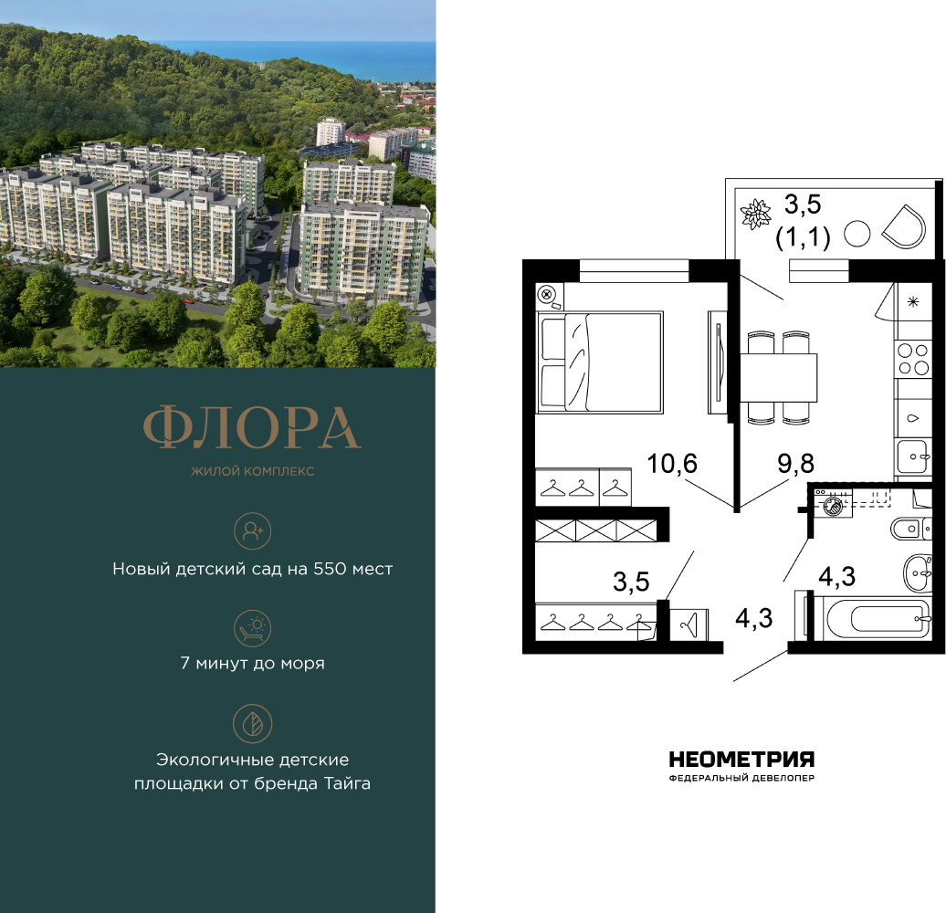 Продается квартира в ЖК «Флора» от федерального девелопера «Неометрия». Это жилой комплекс комфорт-класса в самом зеленом районе Сочи. При проектировании постарались максимально сохранить окружающую флору и фауну. Теплое море, горы, целебные источники, река, близость заповедника – все это уже рядом с вами. Жилой комплекс «Флора» – это: • 4,5 Га благоустроенной территории от дизайн-бюро Cora * 7 минут до моря на машине • Современные экологичные детские площадки от бренда «Тайга» • Яркие аллеи с цветниками и кустарниками для прогулок и утренних пробежек • Благоустроенная набережная с шезлонгами и перголами • Спортивные зоны для любителей пляжного волейбола, бадминтона и йоги - лапомоечные и колясочные в каждом подъезде - подземный паркинг на 429 мест Собственная управляющая компания с функцией «доверительного управления» Кудепста – это прекрасный зеленый оазис, который расположился между историческим центром Сочи и Адлером. Благодаря выгодному местоположению ЖК «Флора» между курортным Адлером и центром Сочи до самых популярных социальных, культурных и развлекательных объектов города можно добраться за считанные минуты: Олимпийский парк. Красная Поляна, аэропорт, жд-вокзал. Кроме того, в шаговой доступности расположена вся необходимая социальная инфраструктура, что удобно для жизни всех членов семьи: • 2 школы; • 3 детских сада; • 3 поликлиники; • 2 фитнес-центра; • 3 магазина и гипермаркета; • спортивная школа • 2 остановки общественного транспорта. На первых этажах комплекса расположены коммерческие помещения – пункты выдачи маркетплейсов, кофейни, магазины. В жилом комплексе соблюден принцип сбалансированных и эргономичных планировочных решений: от компактных студий до просторных семейных квартир. В каждой квартире есть балкон, и установлены увеличенные оконные рамы. На 12 этаже повышенной комфортности открываются потрясающие виды на море и национальный парк благодаря панорамному остеклению лоджий. Квартиру можно купить с черновой отделкой или с готовым ремонтом «Прайм», а также с сертификатом на покупку мебели. Приобрести квартиру можно за наличную оплату, в ипотеку, с привлечением средства маткапитала. (AQID02539446)