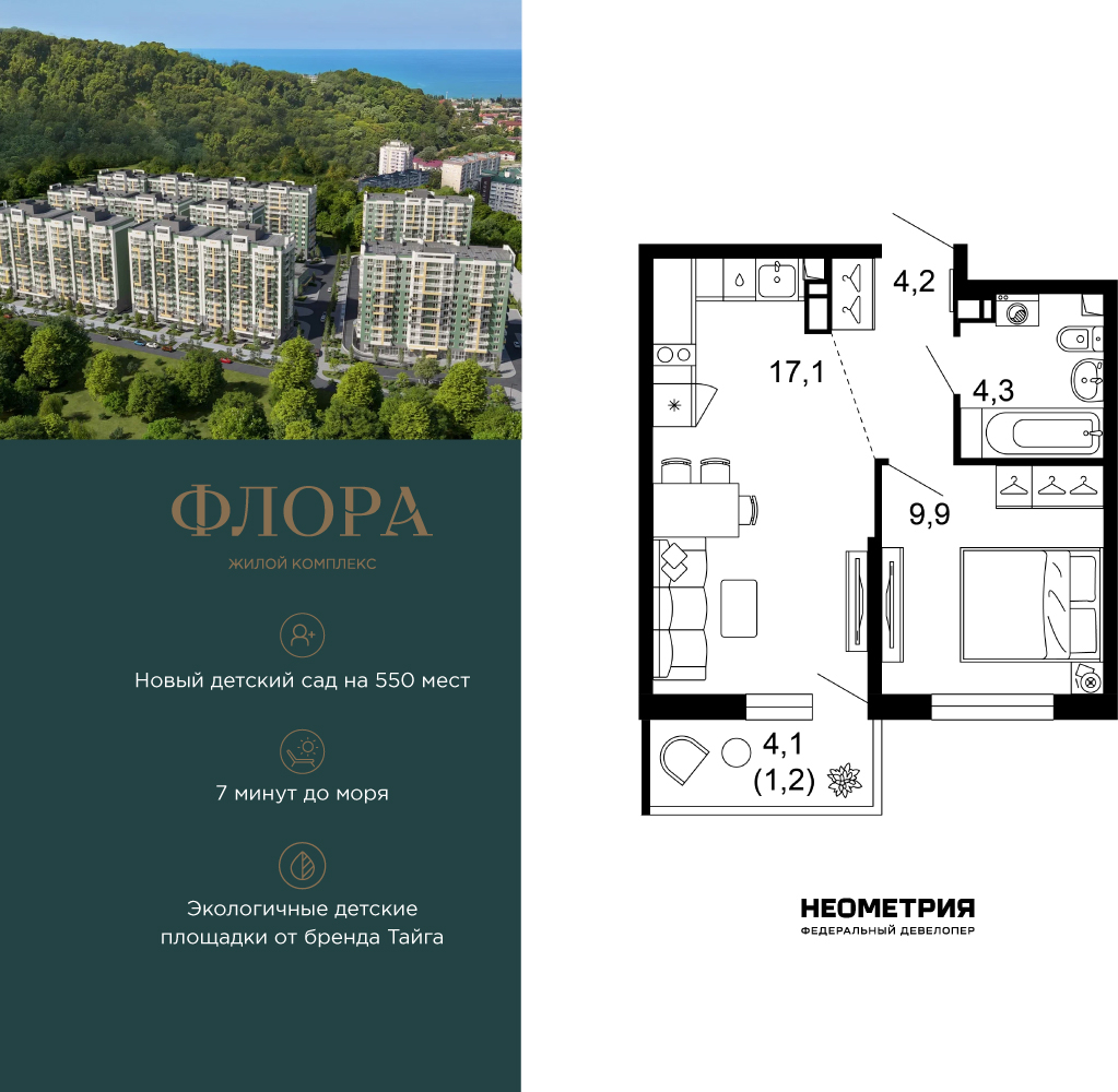 Продается квартира в ЖК «Флора» от федерального девелопера «Неометрия». Это жилой комплекс комфорт-класса в самом зеленом районе Сочи. При проектировании постарались максимально сохранить окружающую флору и фауну. Теплое море, горы, целебные источники, река, близость заповедника – все это уже рядом с вами. Жилой комплекс «Флора» – это: • 4,5 Га благоустроенной территории от дизайн-бюро Cora * 7 минут до моря на машине • Современные экологичные детские площадки от бренда «Тайга» • Яркие аллеи с цветниками и кустарниками для прогулок и утренних пробежек • Благоустроенная набережная с шезлонгами и перголами • Спортивные зоны для любителей пляжного волейбола, бадминтона и йоги - лапомоечные и колясочные в каждом подъезде - подземный паркинг на 429 мест Собственная управляющая компания с функцией «доверительного управления» Кудепста – это прекрасный зеленый оазис, который расположился между историческим центром Сочи и Адлером. Благодаря выгодному местоположению ЖК «Флора» между курортным Адлером и центром Сочи до самых популярных социальных, культурных и развлекательных объектов города можно добраться за считанные минуты: Олимпийский парк. Красная Поляна, аэропорт, жд-вокзал. Кроме того, в шаговой доступности расположена вся необходимая социальная инфраструктура, что удобно для жизни всех членов семьи: • 2 школы; • 3 детских сада; • 3 поликлиники; • 2 фитнес-центра; • 3 магазина и гипермаркета; • спортивная школа • 2 остановки общественного транспорта. На первых этажах комплекса расположены коммерческие помещения – пункты выдачи маркетплейсов, кофейни, магазины. В жилом комплексе соблюден принцип сбалансированных и эргономичных планировочных решений: от компактных студий до просторных семейных квартир. В каждой квартире есть балкон, и установлены увеличенные оконные рамы. На 12 этаже повышенной комфортности открываются потрясающие виды на море и национальный парк благодаря панорамному остеклению лоджий. Квартиру можно купить с черновой отделкой или с готовым ремонтом «Прайм», а также с сертификатом на покупку мебели. Приобрести квартиру можно за наличную оплату, в ипотеку, с привлечением средства маткапитала. (AQID02539489)
