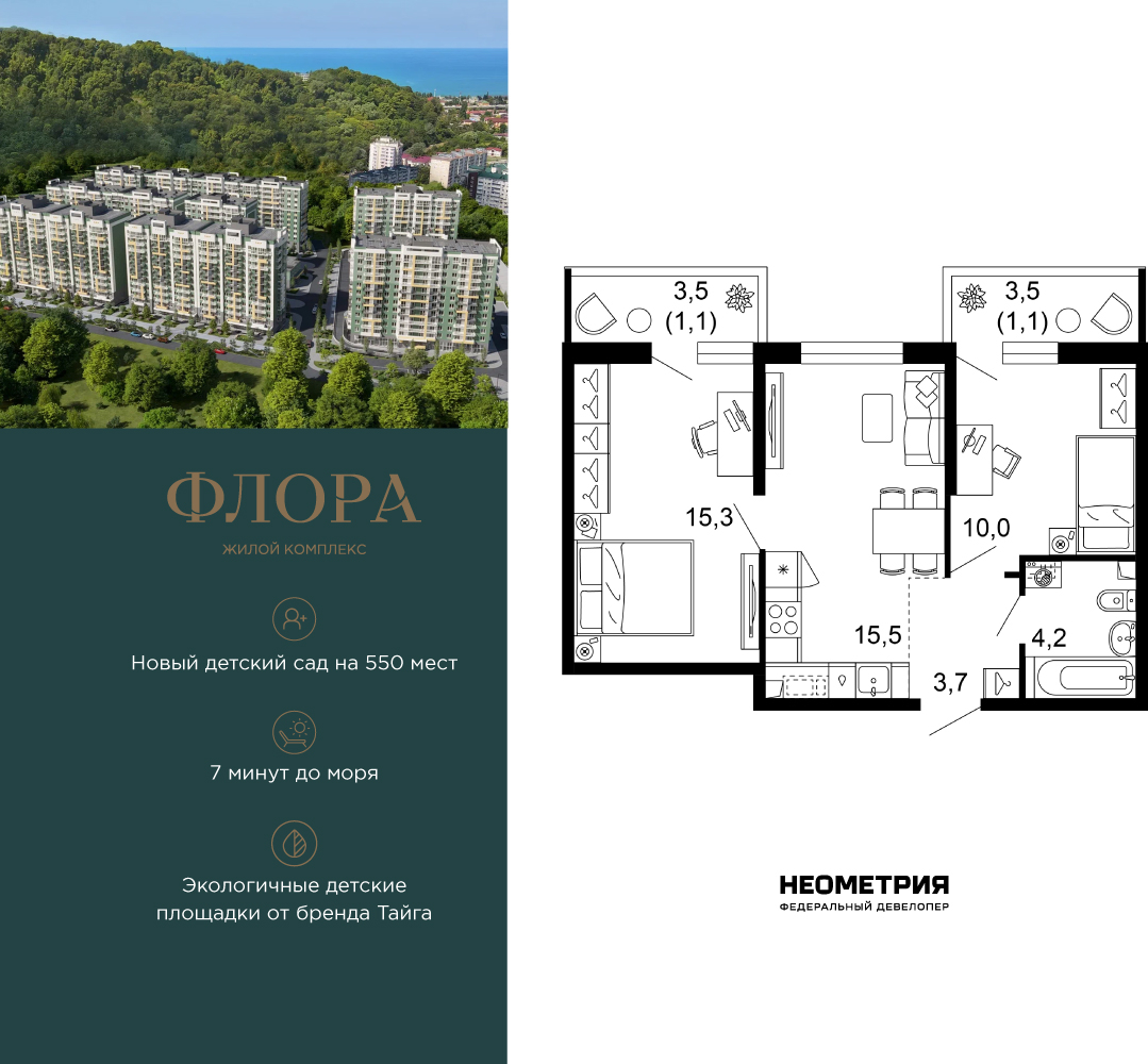 Продается квартира в ЖК «Флора» от федерального девелопера «Неометрия». Это жилой комплекс комфорт-класса в самом зеленом районе Сочи. При проектировании постарались максимально сохранить окружающую флору и фауну. Теплое море, горы, целебные источники, река, близость заповедника – все это уже рядом с вами. Жилой комплекс «Флора» – это: • 4,5 Га благоустроенной территории от дизайн-бюро Cora * 7 минут до моря на машине • Современные экологичные детские площадки от бренда «Тайга» • Яркие аллеи с цветниками и кустарниками для прогулок и утренних пробежек • Благоустроенная набережная с шезлонгами и перголами • Спортивные зоны для любителей пляжного волейбола, бадминтона и йоги - лапомоечные и колясочные в каждом подъезде - подземный паркинг на 429 мест Собственная управляющая компания с функцией «доверительного управления» Кудепста – это прекрасный зеленый оазис, который расположился между историческим центром Сочи и Адлером. Благодаря выгодному местоположению ЖК «Флора» между курортным Адлером и центром Сочи до самых популярных социальных, культурных и развлекательных объектов города можно добраться за считанные минуты: Олимпийский парк. Красная Поляна, аэропорт, жд-вокзал. Кроме того, в шаговой доступности расположена вся необходимая социальная инфраструктура, что удобно для жизни всех членов семьи: • 2 школы; • 3 детских сада; • 3 поликлиники; • 2 фитнес-центра; • 3 магазина и гипермаркета; • спортивная школа • 2 остановки общественного транспорта. На первых этажах комплекса расположены коммерческие помещения – пункты выдачи маркетплейсов, кофейни, магазины. В жилом комплексе соблюден принцип сбалансированных и эргономичных планировочных решений: от компактных студий до просторных семейных квартир. В каждой квартире есть балкон, и установлены увеличенные оконные рамы. На 12 этаже повышенной комфортности открываются потрясающие виды на море и национальный парк благодаря панорамному остеклению лоджий. Квартиру можно купить с черновой отделкой или с готовым ремонтом «Прайм», а также с сертификатом на покупку мебели. Приобрести квартиру можно за наличную оплату, в ипотеку, с привлечением средства маткапитала. (AQID02539518)