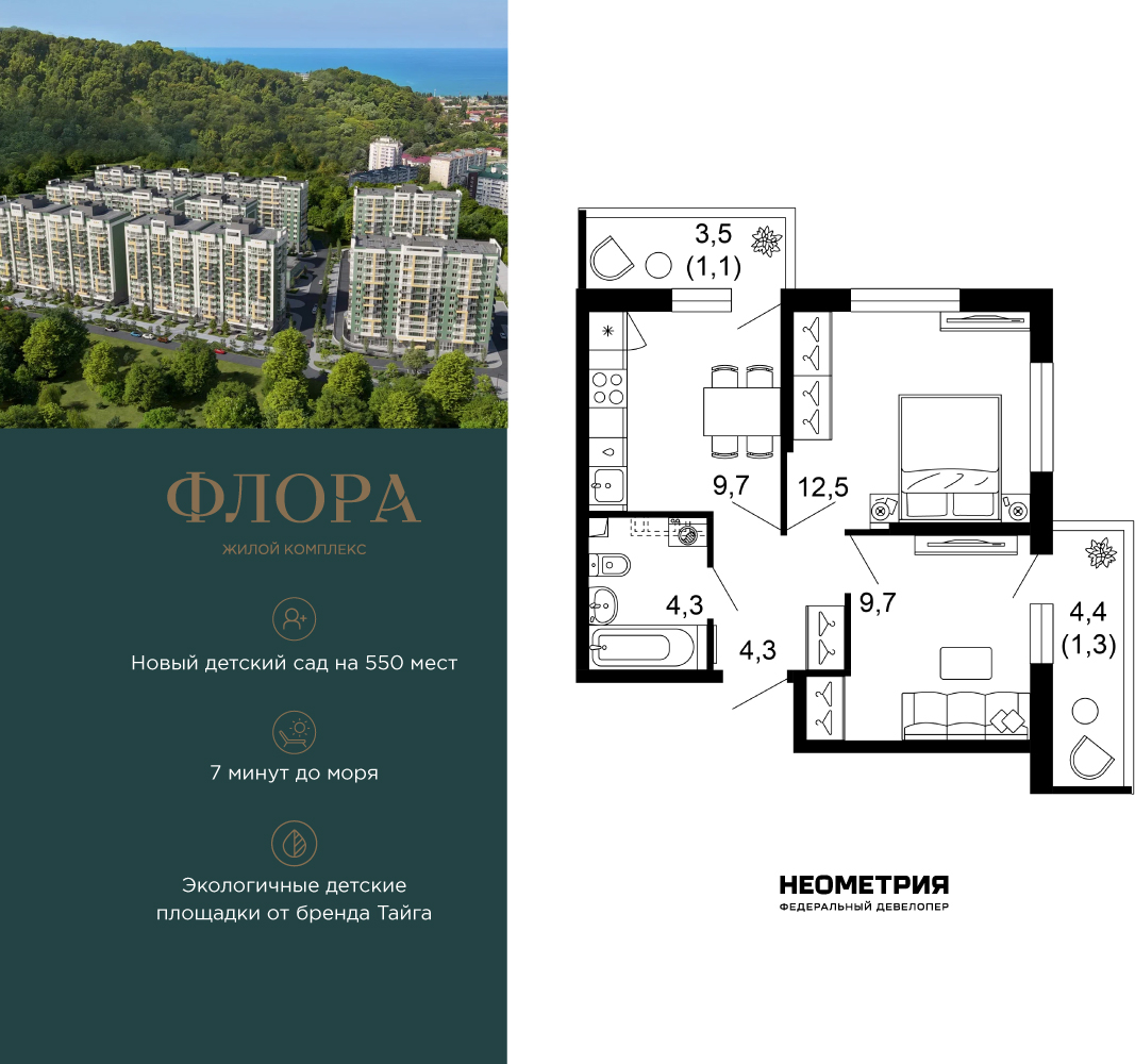 Продается квартира в ЖК «Флора» от федерального девелопера «Неометрия». Это жилой комплекс комфорт-класса в самом зеленом районе Сочи. При проектировании постарались максимально сохранить окружающую флору и фауну. Теплое море, горы, целебные источники, река, близость заповедника – все это уже рядом с вами. Жилой комплекс «Флора» – это: • 4,5 Га благоустроенной территории от дизайн-бюро Cora * 7 минут до моря на машине • Современные экологичные детские площадки от бренда «Тайга» • Яркие аллеи с цветниками и кустарниками для прогулок и утренних пробежек • Благоустроенная набережная с шезлонгами и перголами • Спортивные зоны для любителей пляжного волейбола, бадминтона и йоги - лапомоечные и колясочные в каждом подъезде - подземный паркинг на 429 мест Собственная управляющая компания с функцией «доверительного управления» Кудепста – это прекрасный зеленый оазис, который расположился между историческим центром Сочи и Адлером. Благодаря выгодному местоположению ЖК «Флора» между курортным Адлером и центром Сочи до самых популярных социальных, культурных и развлекательных объектов города можно добраться за считанные минуты: Олимпийский парк. Красная Поляна, аэропорт, жд-вокзал. Кроме того, в шаговой доступности расположена вся необходимая социальная инфраструктура, что удобно для жизни всех членов семьи: • 2 школы; • 3 детских сада; • 3 поликлиники; • 2 фитнес-центра; • 3 магазина и гипермаркета; • спортивная школа • 2 остановки общественного транспорта. На первых этажах комплекса расположены коммерческие помещения – пункты выдачи маркетплейсов, кофейни, магазины. В жилом комплексе соблюден принцип сбалансированных и эргономичных планировочных решений: от компактных студий до просторных семейных квартир. В каждой квартире есть балкон, и установлены увеличенные оконные рамы. На 12 этаже повышенной комфортности открываются потрясающие виды на море и национальный парк благодаря панорамному остеклению лоджий. Квартиру можно купить с черновой отделкой или с готовым ремонтом «Прайм», а также с сертификатом на покупку мебели. Приобрести квартиру можно за наличную оплату, в ипотеку, с привлечением средства маткапитала. (AQID02539519)