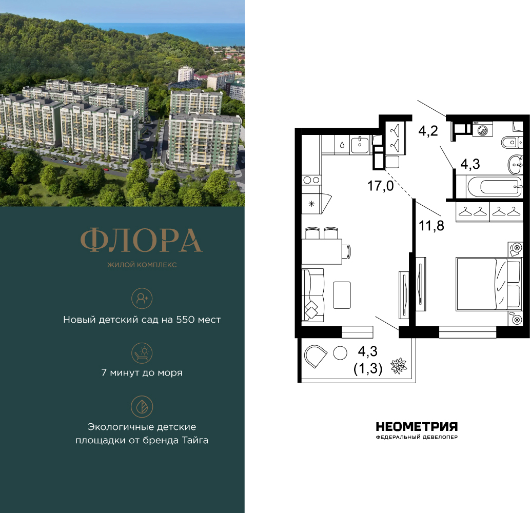 Продается квартира в ЖК «Флора» от федерального девелопера «Неометрия». Это жилой комплекс комфорт-класса в самом зеленом районе Сочи. При проектировании постарались максимально сохранить окружающую флору и фауну. Теплое море, горы, целебные источники, река, близость заповедника – все это уже рядом с вами. Жилой комплекс «Флора» – это: • 4,5 Га благоустроенной территории от дизайн-бюро Cora * 7 минут до моря на машине • Современные экологичные детские площадки от бренда «Тайга» • Яркие аллеи с цветниками и кустарниками для прогулок и утренних пробежек • Благоустроенная набережная с шезлонгами и перголами • Спортивные зоны для любителей пляжного волейбола, бадминтона и йоги - лапомоечные и колясочные в каждом подъезде - подземный паркинг на 429 мест Собственная управляющая компания с функцией «доверительного управления» Кудепста – это прекрасный зеленый оазис, который расположился между историческим центром Сочи и Адлером. Благодаря выгодному местоположению ЖК «Флора» между курортным Адлером и центром Сочи до самых популярных социальных, культурных и развлекательных объектов города можно добраться за считанные минуты: Олимпийский парк. Красная Поляна, аэропорт, жд-вокзал. Кроме того, в шаговой доступности расположена вся необходимая социальная инфраструктура, что удобно для жизни всех членов семьи: • 2 школы; • 3 детских сада; • 3 поликлиники; • 2 фитнес-центра; • 3 магазина и гипермаркета; • спортивная школа • 2 остановки общественного транспорта. На первых этажах комплекса расположены коммерческие помещения – пункты выдачи маркетплейсов, кофейни, магазины. В жилом комплексе соблюден принцип сбалансированных и эргономичных планировочных решений: от компактных студий до просторных семейных квартир. В каждой квартире есть балкон, и установлены увеличенные оконные рамы. На 12 этаже повышенной комфортности открываются потрясающие виды на море и национальный парк благодаря панорамному остеклению лоджий. Квартиру можно купить с черновой отделкой или с готовым ремонтом «Прайм», а также с сертификатом на покупку мебели. Приобрести квартиру можно за наличную оплату, в ипотеку, с привлечением средства маткапитала. (AQID02539539)
