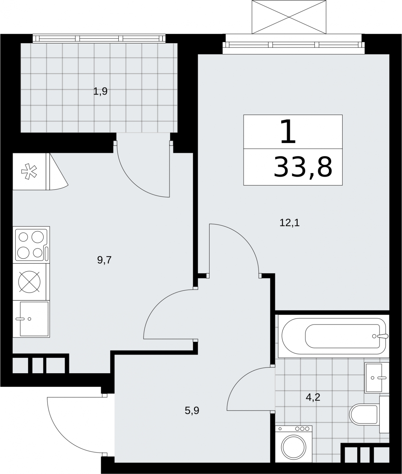 - Общая площадь 33.8 м²